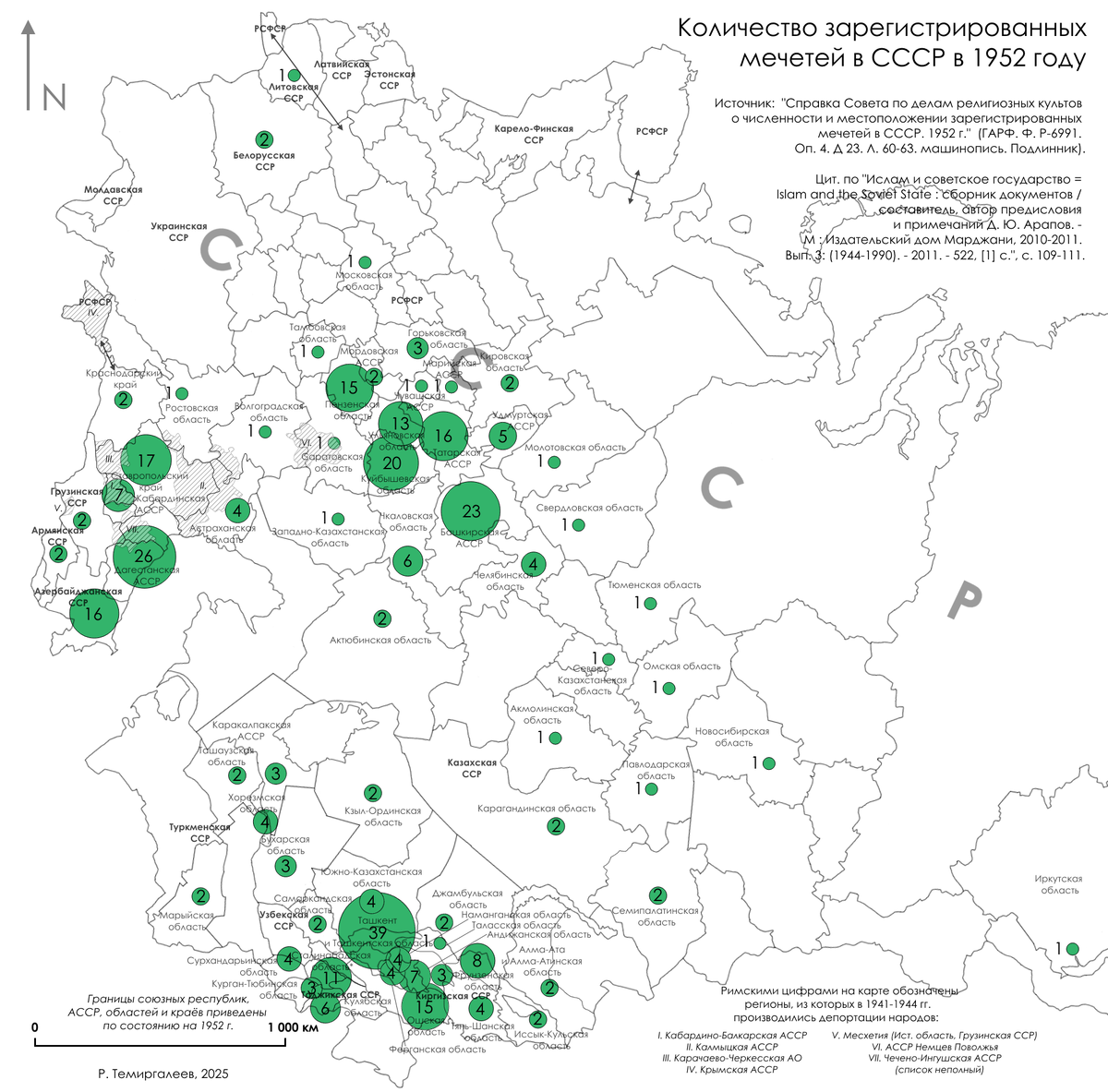Значительные области Северного Кавказа к началу 1950-х были зонами тотального запустения после массовых депортаций чеченцев, ингушей, карачаевцев и балкарцев (что наглядно видно даже на сетке АТД по состоянию на 1952 год с «Грозненской областью», Приэльбрусьем, Карачаем и югом ЧИАССР в составе Грузинской ССР). В этом отношении к ним примыкает и Крым, где к 1952 году не осталось ни одной официально зарегистрированной мечети. Обращает на себя внимание и полное отсутствие зарегистрированных мечетей в Северной Осетии, в том числе не работала историческая Владикавказская соборная мечеть.