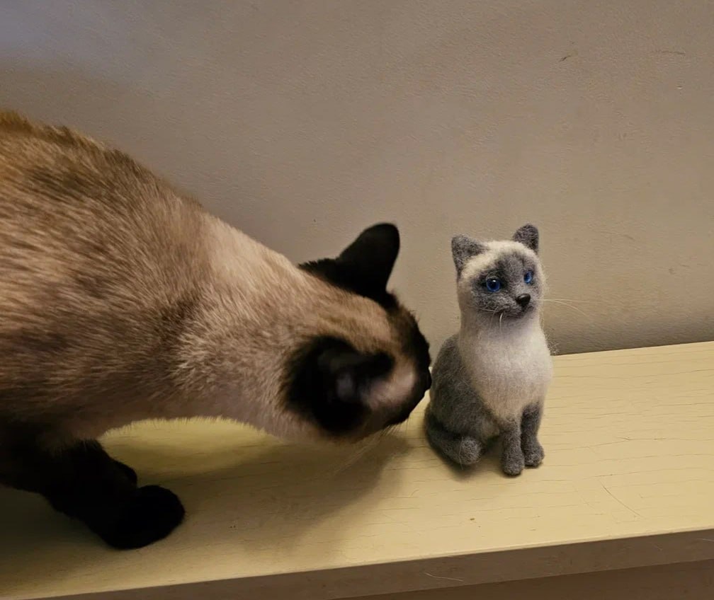 Их портретное сходство покажу в следующем сообщении, сделав совместное фото рядом. 📸 Тиша, при встрече с маленьким Стёпой традиционно пытался выгрызть ему вибриссы. 😀 Аллочка, я извините голосовое запишу, но правда я была просто потрясена насколько насколько это похоже на Стёпу, насколько это было шикарное что-то. Я глазам не поверила насколько это можно в принципе создать такое шедевр. Поэтому я прям безумно благодарна за вашу работу. Я представляю насколько это трудоемко, но вы настолько смогли передать, прям реально. Я даже своему товарищу мужу задала вопрос сразу, угадай, кто это. Степка, конечно. То есть это просто потрясающе. Вы, ну не знаю, вы талантище. И это прям круто. Это один из моих лучших подарков от Танюши. Я очень благодарна, что вы сделали эту работу настолько здорово, что у меня даже эмоций не хватает. Хотя я вроде как не особо эмоциональный человек. Так что спасибо вам огромное. Для меня это особенный подарок. И спасибо, что вы написали. Я прям рада видеть своего