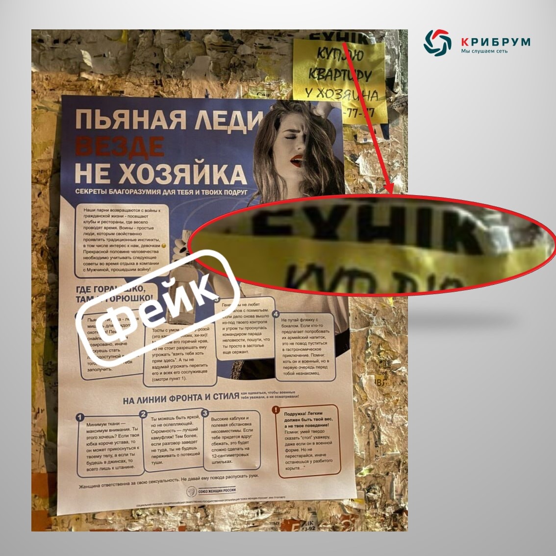 Ранее мы уже рассказывали о ложных акциях «Солдат ребенка не обидит», «Бьет — значит больно» и о якобы запущенном российским клубом самообороны курсе защиты от ветеранов. В этот раз речь пойдет об акции «Пьяная леди — везде не хозяйка», которая якобы была запущена по инициативе «Союза женщин России». Суть «акции» — распространение правил отдыха женщин в компании вернувшихся с СВО солдат. 🔶 Распространяться новости об «акции» начали в чате пермского городского сообщества, где некая Зарина Яковлева опубликовала фото с плакатом с советами по общению с военнослужащими, вернувшимися из зоны СВО. Страница Зарины, как это обычно бывает в таких случаях, оказалась ненастоящей – фото взяты со страницы жительницы Владивостока Марии Дмитриевой. 🔶 В «Союзе женщин России» причастность к плакатам опровергли, отметив, что абсурдность «акции» заведомо говорит о её фальшивости. Также авторов «акции» выдала одна незаметная, но важная деталь. На некоторых фотографиях плаката сверху можно заметить обрыво