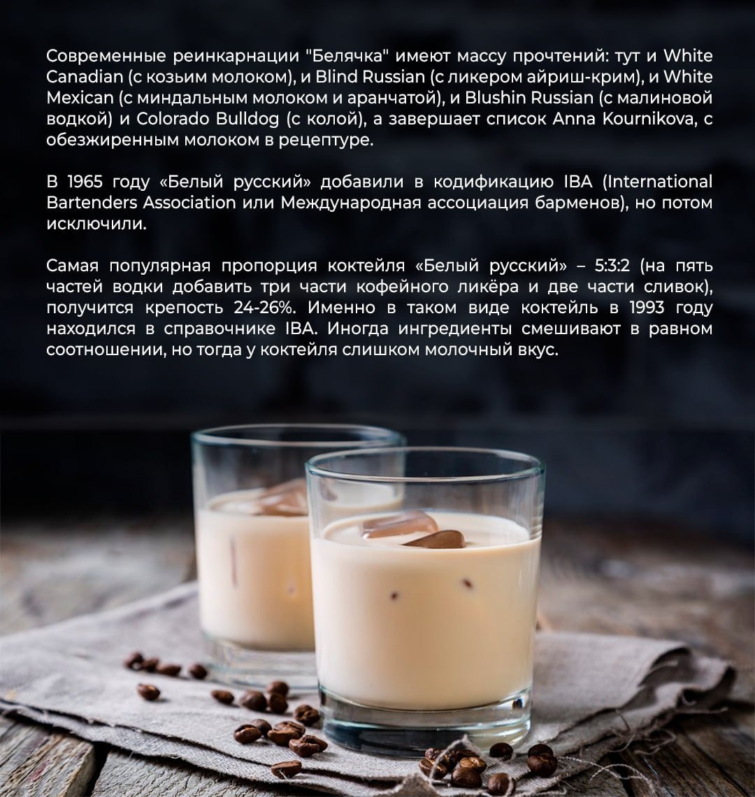 «Белый русский» — это алкогольный коктейль крепостью 20-28 градусов (зависит от пропорций) со сладковатым кофейно-молочным вкусом.☕️ В классическом варианте состоит из трёх ингредиентов: водки, кофейного ликёра и сливок. Считается одним из самых популярных молочных коктейлей в мире.😳 Другие названия: «Белорус» (потому что одновременно и белый, и русский), «коктейль Лебовски», «Дюдя» и «Чувак» (три последних – отсылка к фильму). При наличии кофейного ликёра, этот коктейль легко сделать в домашних условиях путём смешивания всех ингредиентов в бокале для подачи.👍 ❗️Существует две версии появления «Белого русского» коктейля. Согласно первой, рецепт придумали в конце 20-х годов XX века во Франции и назвали в честь белогвардейцев, бежавших из России после поражения в гражданской войне.🧐 На Западе участников Белого🤍 движения тогда называли «white russians». В сборниках для барменов коктейль из водки, какао ликёра и сливок появился в 1930 году, но сначала рецепт назывался «Белый медведь (P