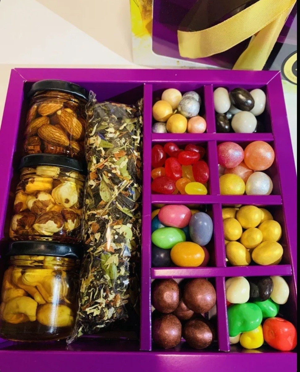 Подарочный набор элитного чая, орешек в меду и 8 видов сладостей с Юга России. Арт:989709077 Подарочный набор "Хорошего дня" состоит из авторского чая "Букет Абхазии", орешек в меду с Юга России и 8 сладостей - находка для самых изысканных гурманов. Чай "Букет Абхазии" - вкусный и полезный фруктовый чай, в составе которого черный чай, василек, шафран имеретинский, лепестки ромашки, кусочки клубники, лист брусники. Этот чай поднимает настроение и придает силы, а также обладает приятным, запоминающимся вкусом и ароматом. Орешки в меду: кешью, фундук, миндаль. Ассорти из 8 видов орехов и сладостей на выбор в зависимости от сезона: шоколадные рисовые шарики, ананас в шоколаде, помело, кумкват мандарин, разнообразный мармелад со вкусом фруктов, позолоченный арахис, орехи в цветной и шоколадной глазури, рахат лукум, драже мармеладное, цукаты. Праздничная коробка размером 18 * 18* 4 см. перевязана красивой золотой лентой, весом 680 грамм. Подарок бережно упакован в дополнительную защитную к