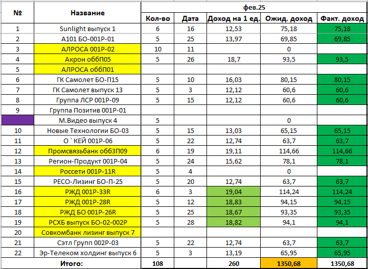 Здравствуйте коллеги инвесторы. Сегодня 3 марта 2025 года и вот какие изменения случились по портфелю. Как и ожидалось поступили февральские купоны по облигациям "РСХБ выпуск БО-02-002P" в сумме 94,1 рублей за 5 штук ценных бумаг. Таким образом февраль 2025 закрылся по плану на 1350,68 рублей. Потихоньку начинаю учиться управлять портфелем и сегодня был сделан первый шаг. Видно на скрине что облигации "М.Видео выпуск 4" выделены фиолетовым цветом и исключены из нумерации списка активов. По этим "бумагам" был проведен небольшой анализ. Величина купона 32,54 рублей. Но это за одну облигацию раз в квартал. То есть в месяц получается 32,54 / 3 =10,85 рублей. Можно увидеть на скрине со списком облигаций в портфеле что доходность может превышать 19 рублей в месяц. Почти в 2 раза. По этому пункту облигации "М.Видео выпуск 4" получили -1 бал:) Тоже в моем случае не очень удобно. По крайней мере пока облигаций не много хочется получать купоны каждый месяц, а не 4 раза в год. В моей классификаци