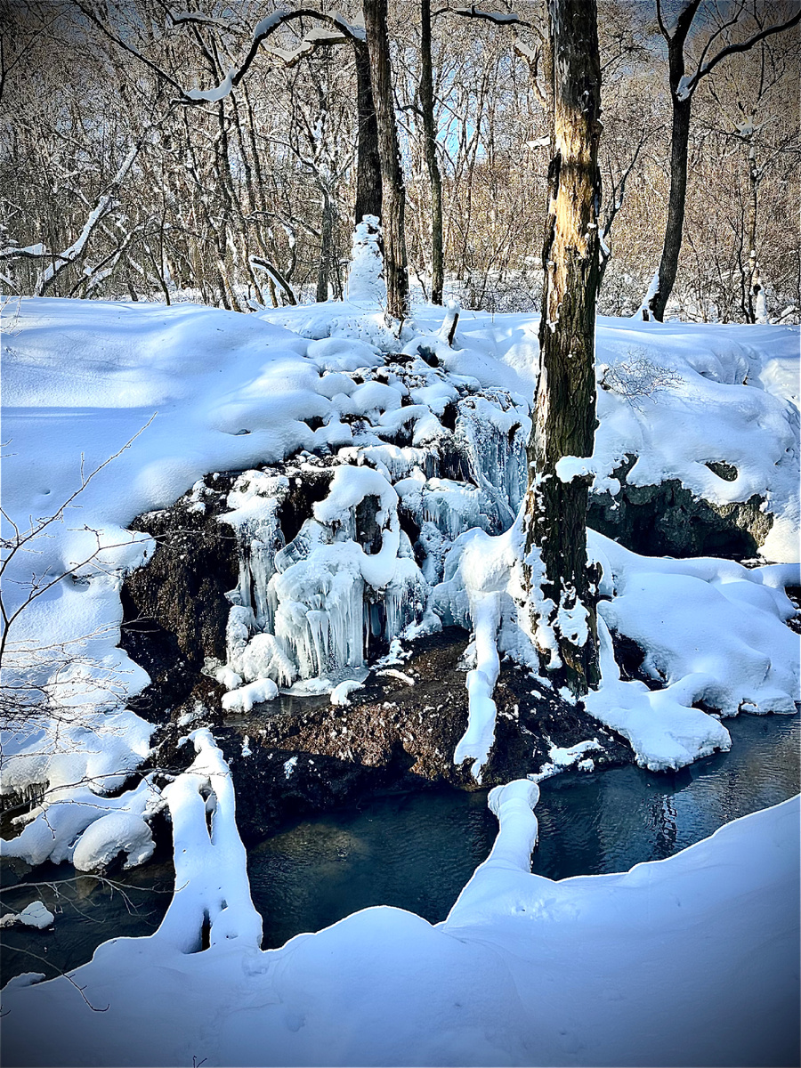 1 Марта 2025 год. Этой зимой нас порадовала погода: выпало очень много снега. Поэтому мы решили сходить в небольшой зимний поход по лесу. Водопадик на реке Бучинская Гремучка. Это было первое место которое мы посетили. Травертиновая балка в Русском лесу города Ставрополь — самое крупное на Ставропольской горе отложение травертинов и место произрастания реликтовых растений. С источника вода попадает в небольшой водоём, а уже с него побежала водичка чтобы рухнуть с 6 метровой высоты и порадовать нас, это место "падения" часто называют Бучинским водопадиком 🌐 координаты: 45.045610, 41.891150 Интересная картина.Тени от деревьев создают на снегу забавные узоры, похожие на зебру.☺️ Кто то протоптал нам тропинку) Конечно, идти по снегу не легко. Жека находил себе места для отдыха😅 Иногда даже полз на коленях😅 Чайку чтобы согреться. Беспутская поляна , в народе больше известные как Крест. Известно, что над полянами когда-то произошло крушение самолёта, из найденных