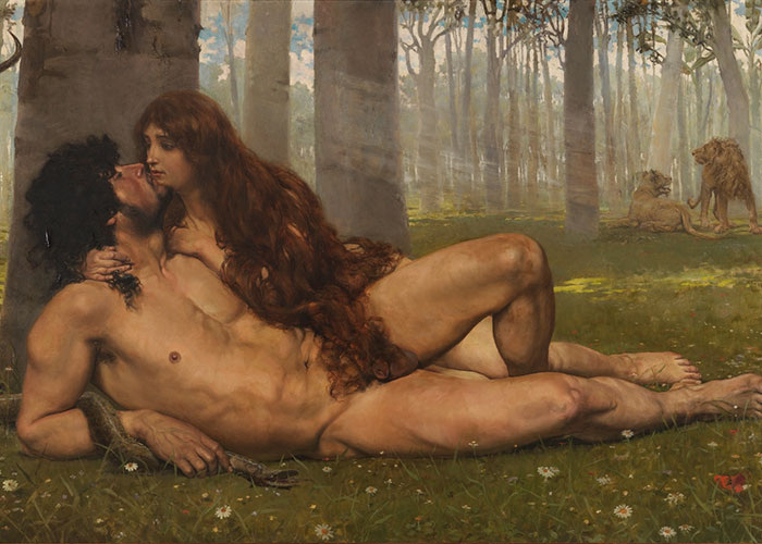 Ева Адам! Адам! приникни ближе, Прильни ко мне, Адам! Адам! Свисают ветви ниже, ниже, Плоды склоняются к устам. Адам Приникни ближе, Ева! Ева! Темно. Откуда темнота? Свисают ветви справа, слева, Плоды вонзаются в уста. Ева Адам! Адам! кто ветви клонит? Кто клонит, слабую, меня? В певучих волнах тело тонет, Твои - касанья из огня! Адам Что жжет дыханье, Ева! Ева! Едва могу взглянуть, вздохнуть... Что это: плод, упавший с древа, Иль то твоя живая грудь? Ева Адам! Адам! я - вся безвольна... Где ты, где я?., все - сон иль явь? Адам! Адам! мне больно, больно! Пусти меня - оставь! оставь! Адам Так надо, надо, Ева! Ева! Я - твой! Я - твой! Молчи! Молчи! О, как сквозь ветви, справа, слева, Потоком ринулись лучи! Ева Адам! Адам! мне стыдно света! О, что ты сделал? Что со мной? Ты позабыл слова запрета! Уйди! уйди! дай быть одной! Адам Как плод сорвал я, Ева, Ева? Как раздавить его я мог? О, вот он, знак Святого Гнева, - Текущий красный, красный сок. Валерий Яковлевич Брюсов, январь 1905 года Ис