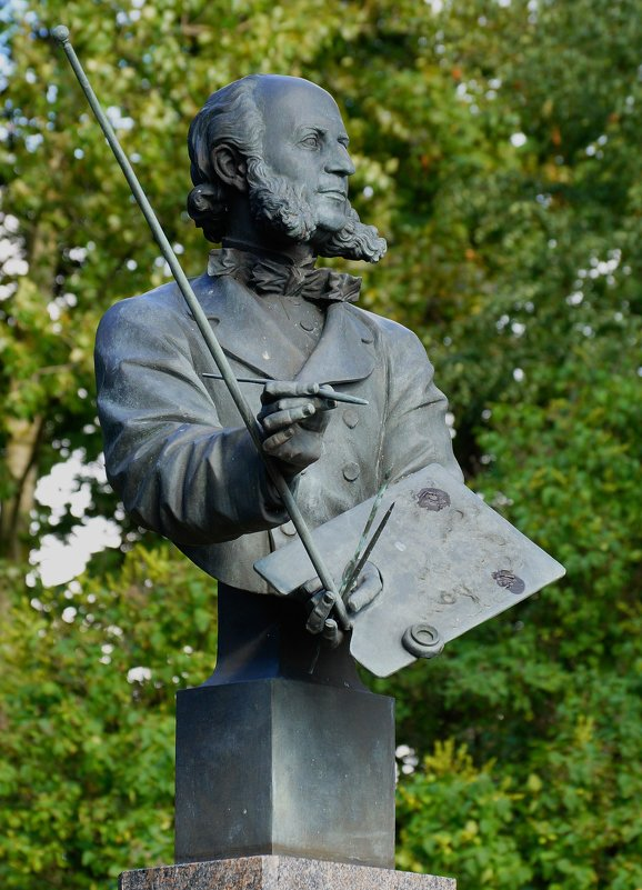 Ну, а теперь вернемся к памятнику. Обратила внимание, что многих озадачивает палка в руках живописца. Не каждому ведь известно, что такое муштабель и для чего он нужен. Если бы художник был изображен перед мольбертом, то было бы всё понятно без дополнительных разъяснений. Но полумольберт у полуфигуры смотрелся бы еще более странно. Особенно в сочетании с каким-то лихорадочным взглядом...