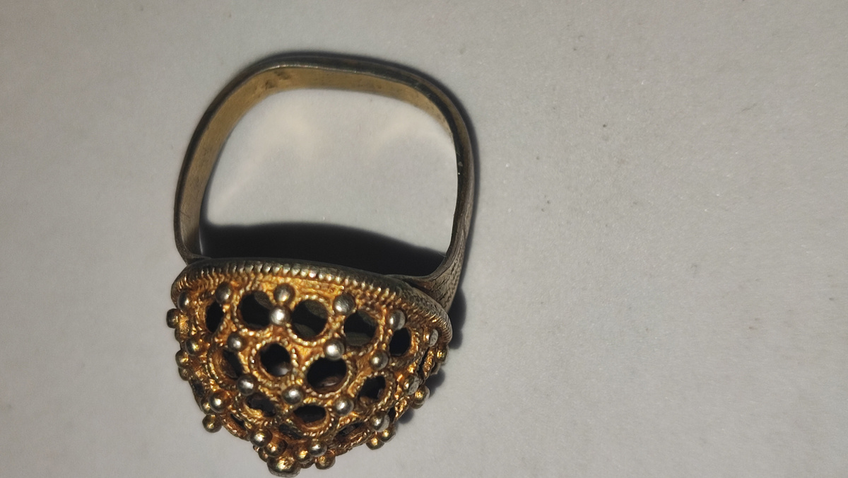 Предположительно старина-старина. Купил за 100 долларов... Клейм никаких нет. Армянские (1971) и Азербайджанские перстни 1959 и два 1969 гг.. Типичные восточные элементы декора... Типа "пауков" Вот непонятный перстень. Что за камень - не знаю... Кальцит? Припаяна цепочка по кругу и по углам 4 "медальки" Ростов-на-Дону, финифть в серебре. Крнец 70-х. Опять Кавказ... Крстромская инспекция: А это была Москва. Техника филиграни - не сложная, но нудная... Ручной работы много... Свердловск... А это хоть и похоже на Урал, но Прибалтика: На этом перстеньке на основу 875 пробы напаяны элементы 916 пробы: Думаю, что статей про филигрань достаточно? :0)