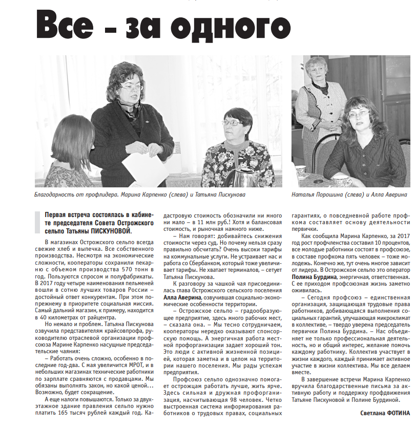 С. Фотина Все – за одного//Профсоюзный курьер. – 2018.- 20 июня.- с. 4 Первая встреча состоялась в кабинете председателя Совета Острожского сельпо Татьяны Пискуновой. В магазинах Острожского сельпо всегда свежие хлеб и выпечка. Все собственного производства. Несмотря на экономические сложности, кооператоры сохранили пекарню с объемом производства 570 тонн в год. Пользуются спросом и полуфабрикаты. В 2017 году четыре наименования пельменей вошли в сотню лучших товаров России – достойный ответ конкурентам. При этом по-прежнему в приоритете социальная миссия. Самый дальний магазин, к примеру, находится в 40 километрах от райцентра. Но немало и проблем. Татьяна Пискунова озвучила представителям крайсовпрофа, руководителю отраслевой организации профсоюза Марине Карпенко насущные председательские чаяния: – Работать очень сложно, особенно в последние год-два. С мая увеличится МРОТ, и в небольших магазинах технические работники по зарплате сравняются с продавцами. Мы обязаны выполнять закон, н