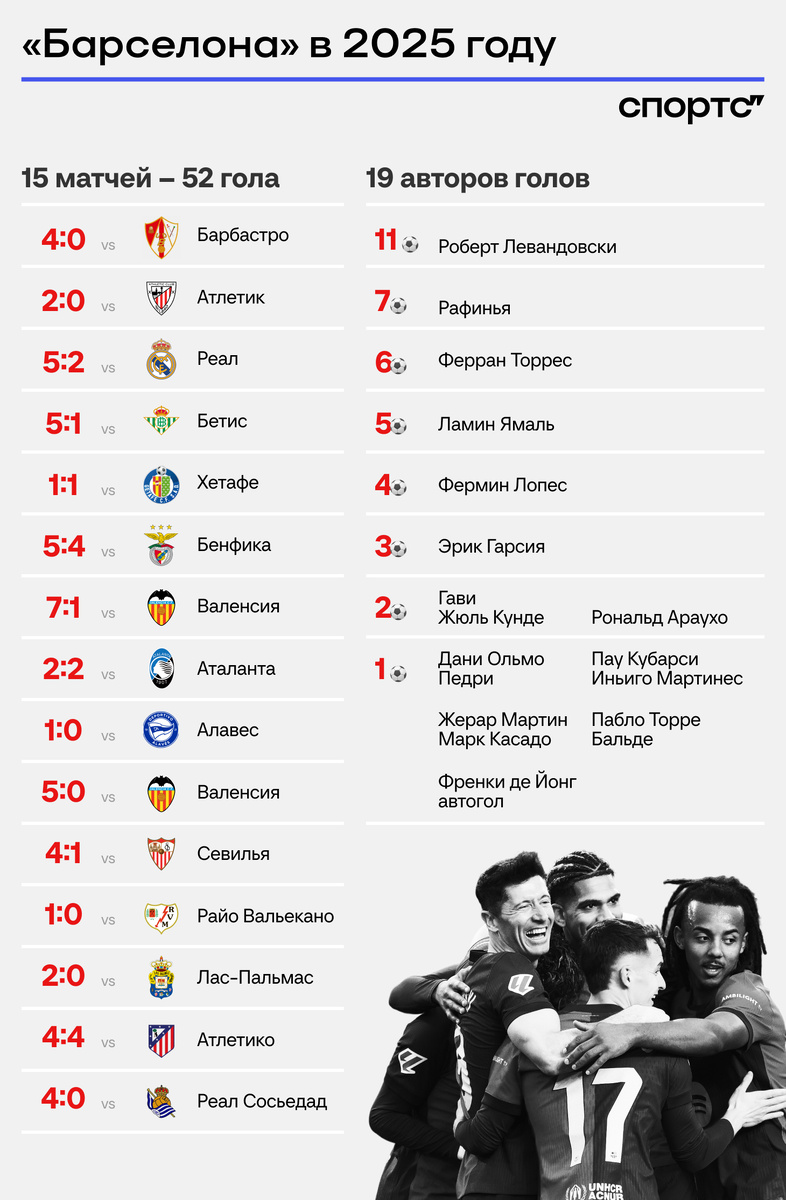 Выиграли один трофей, в погоне еще за тремя. «Барселона» крупно обыграла «Реал Сосьедад» (4:0) в 26-м туре Ла Лиги и укрепилась на первом месте. У команды Ханса-Дитера Флика очень запоминающийся отрезок: она с легкостью забивает четыре-пять и даже семь голов в этом году. С начала календарного года – сильное выступление с 12 победами в 15 играх Вот что за серия во всех турнирах: «Барса» мрачно завершала 2024-й в чемпионате: неожиданно уступила «Леганесу», а потом еще и из-за гола на 90+6 проиграла «Атлетико». В таблице было отставание от лидера на три очка, а по потерянным – на шесть, так как «Барса» сыграла на матч больше. А теперь идет первой, опережая на очко «Атлетико» и на три – «Реал». За это время «Барса» успешно поучаствовала в четырех соревнованиях. ● В Ла Лиге – лучшие с отрывом в 2025-м: взяли 19 очков в семи играх с разницей мячей 20:3. Самая громкая победа – 7:1 над «Валенсией». ● В Лиге чемпионов – прекрасный камбэк с «Бенфикой» (5:4) и упорное противостояние с «Аталантой»