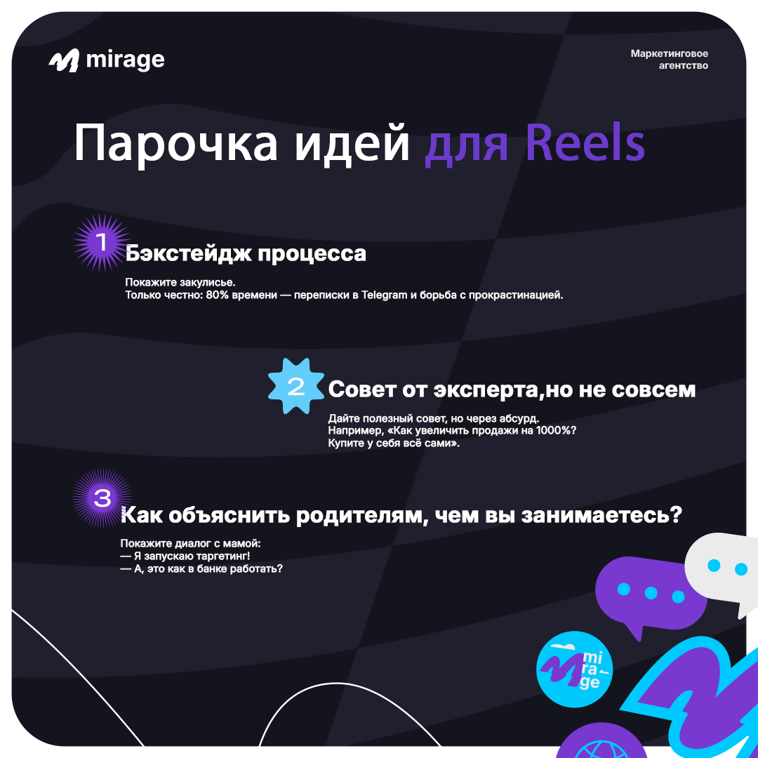 Спойлер: никак. Но притворяться, что вы на гребне волны, — святое дело. Видеоконтент уже не роскошь, а суровая необходимость. Если бренда нет в ленте Reels, значит, его не существует. Что делать? Для начала хватит шарахаться от TikTok, как от прокажённого. Скачайте. Там можно найти годные идеи для контента. А пока ловите парочку идей для Reels 💡 Ставьте лайк и подписывайтесь, если ещё этого не сделали 😐