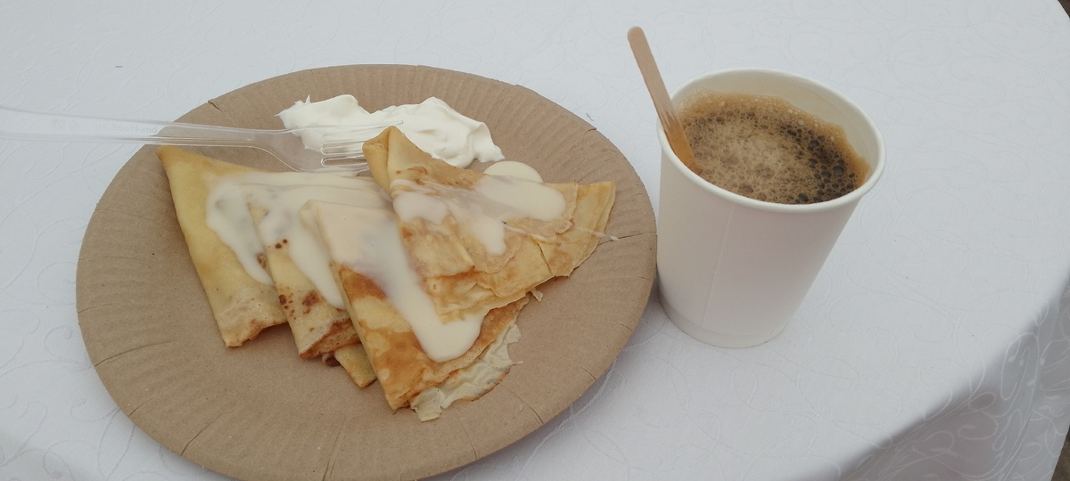 На прошлой неделе дочка 2 раза пекла блины, так что немного Масленицу отметили. Раньше мы ещё на празднование ездили, но я поняла, что это для меня слишком холодно, всегда мёрзну и далеко выбираться не собиралась. Рядом с моим домом есть парк, иногда в нём проходят разные мероприятия и они мало афишируются, поэтому толпы нет. В субботу пошла я одна посмотреть на всякий случай, а там моя любимая халява 😀 Раздавали блины со сгущенкой и чаем, очереди не было, я взяла. Песни, танцы, развлечения для детей как обычно. А потом была лотерея) Раздали билеты и тянули номера. Можно было выиграть сахар, муку, сковородку, чайник, блендер, тостер, но я ничего не выиграла. В какой-то год на такой же праздник от муниципального образования приходил Милонов 😬 В этот раз его не было)) А в воскресенье блины опять с утра раздавали, тоже в парке, но в другом месте, у церкви. И тут уже прям шведский стол. Сгущенка, сметана, варенье, чай, кофе, баранки. Получился у меня бесплатный завтрак. Завела ещё один