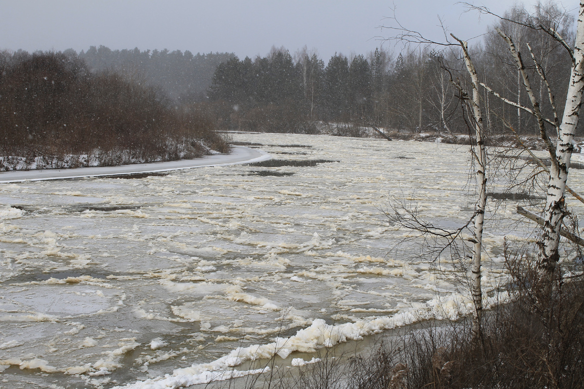 Этой зимой Клязьма замерзла рано, но сильная февральская оттепель заставила реку вскрыться.Начался ледоход и пошла шуга. Не каждый год увидишь такое, обычно лёд уходит внезапно, вечером стоял, а утром уже река чистая. Не известно, будет ли в этом году половодье. Снега очень мало. Кое-где в заливах ещё сидят рыбаки. Вот только на лёд сейчас выходить надо с определённой осторожностью.