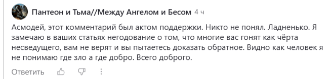 Мнение каждого человека субъективно. И здесь произошло тоже самое. Если на одном канале ко мне отнеслись как к бездарной и неграммотной твари, то на дружественных им каналах, за счет подковерных игр, началось тоже самое. Лично эти каналы я посетил после их активности в ответах на мои комментарии и ответил в соотвествии с их уровнем. Естественно на них это не повлияло.. А через время на моем канале появились им дружественные гости, а именно личность, которая решила доказать собственную правоту и убедиться в ее правильности. Опять же с докладом к дружественным ей каналом о том какой я дурной, тупой и малограммотный. В частности убеждая меня в подселениях, и даже сделала попытку нарисовать якобы меня, но результат был отрицательный. Она нарисовала моего знакомого, с которым я периодически виделся, а в процессе настройки она перешла на его энергоканал, призывая его Дух, а не мой. Она решила нари
