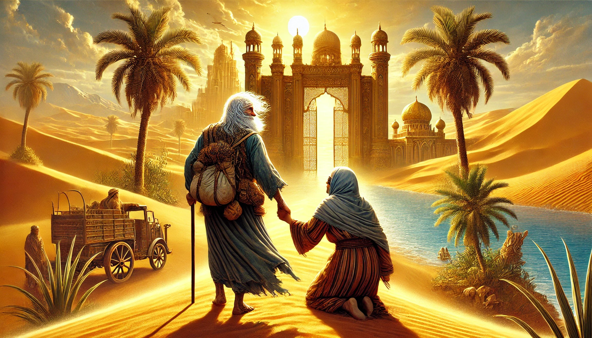 Шли двое — седой старец Амир и слепая старуха Лейла — брели сквозь этот ад, привязанные друг к другу невидимой нитью долгих лет. Сумка с жалкими пожитками натирала плечи, а песок хрустел на зубах, смешиваясь с горьким вкусом отчаяния. Лейла, опираясь на дрожащую руку мужа, шептала сухими губами: «Сколько еще?» — но Амир лишь крепче сжимал ее пальцы, боясь, что даже слово украдет у них последние силы. И вот когда мираж стал реальностью, Амир не поверил глазам своим. Это был оазис, это был настоящий рай среди бесконечной пустыни: