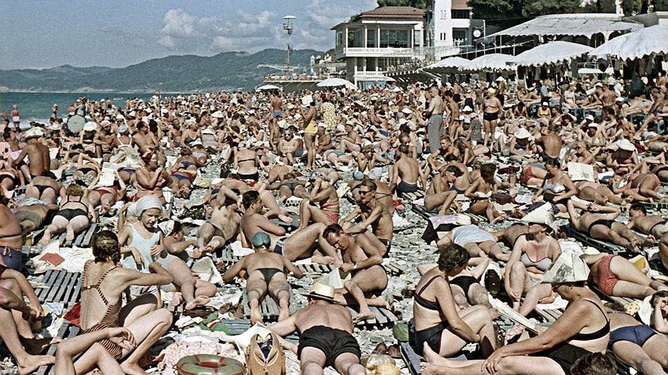 Мои родители в советское время работали на вполне себе военном предприятии. Помимо прочего, это означало, что возможности поездок по заграницам для нашей семьи были ограниченными, если не сказать жестче. Хотя при чем тут военные предприятия? В те времена наши люди в принципе не то что в булочную на такси не ездили[1] — они за редкими исключениями предпочитали проводить отпуска, не выезжая за рубежи нашей огромной Родины. А может быть, и не предпочитали — просто выбора не было. И в этих рубежах особое место занимали два курорта: Южный берег Крыма и Сочи. На них приходилось большинство из 20 миллионов отдыхающих на Черноморском побережье работников физического и умственного труда. Причем Сочи притягивал особенно сильно. Что тогда происходило на пляжах, можно отчасти представить по кадрам из фильма «Будьте моим мужем», но и это еще были цветочки: снимали в Лоо. Вот, нашел пару архивных фотографий пляжа «Ривьера» в центре Сочи.