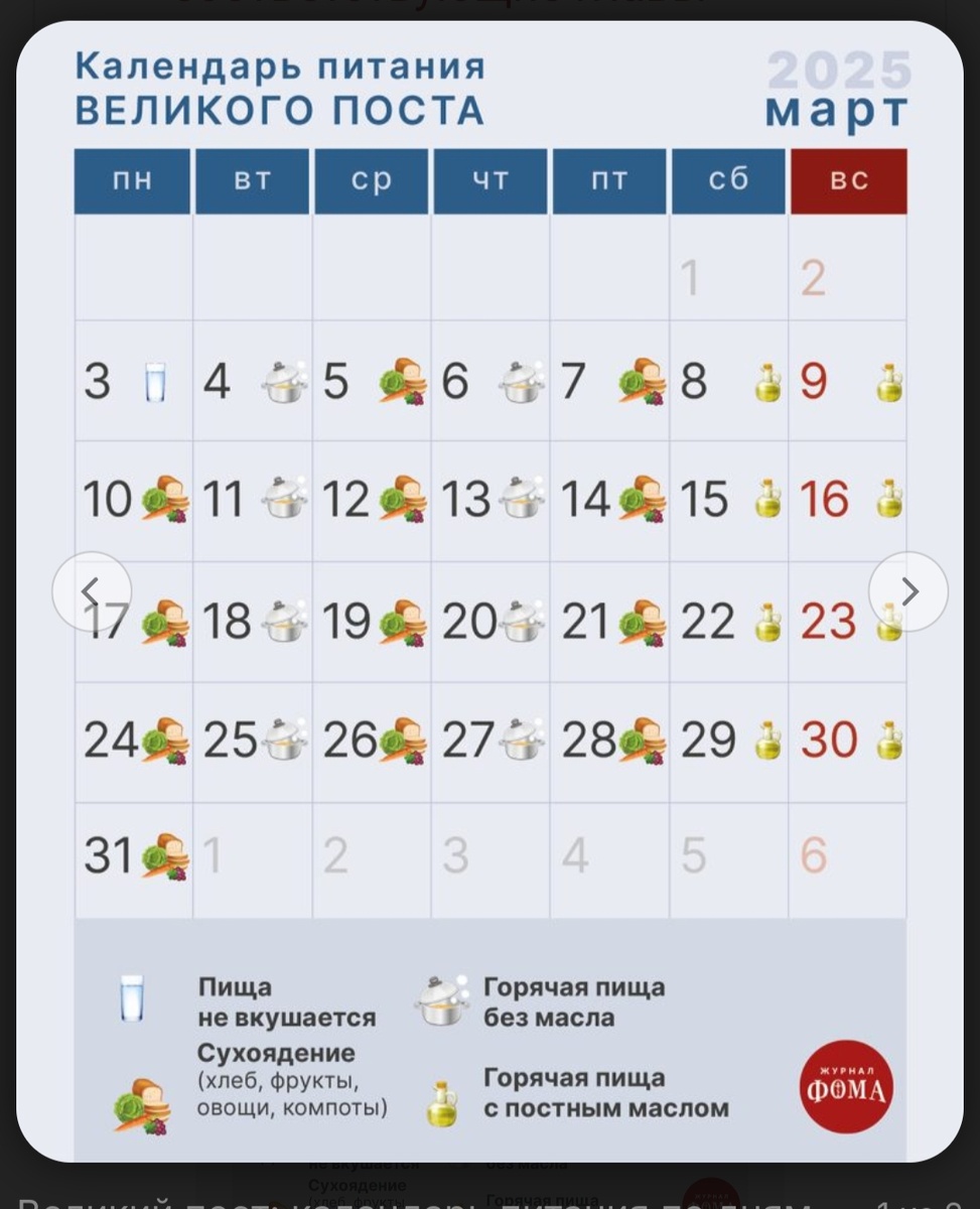 В календаре указано, какой вид пищи можно употреблять в тот или иной день.