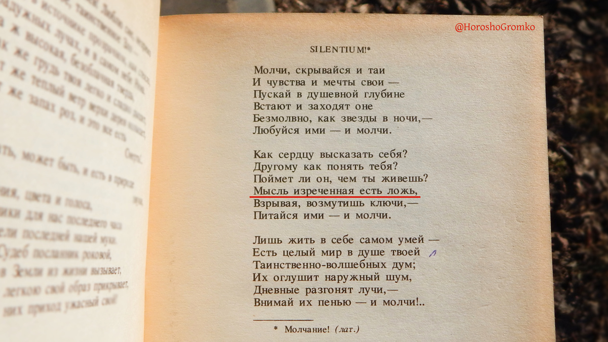 Знаменитая фраза - это строчка из стихотворения Тютчева «Silentium!». Стихотворение коротенькое, из трёх строф всего, вот оно целиком: Автор, Фёдор Иванович Тютчев, жил в 19 веке, был дипломатом, государственным чиновником и - поэтом. Насчет его бюрократических талантов судить не могу, а в поэзии он был действительно одарён. Гениальное «Я встретил вас, и всё былое», например, тоже Тютчевские строки. Заодно в процессе знакомства с биографией Тютчева выяснилось, что поэт наш был та ещё кобелина. От двух жён и только тех любовниц, что были «официально признанными», я насчитала 11 штук детей. Говорят, Чингизхан сбацал столько потомков, что если покопаться, он нам всем окажется пра-пра-пра-пра-дедушкой. Ха! Они Тютчева не видели. В этом контексте неудивительно, что большая часть творчества Тютчева представляет собой любовную лирику. Но - не Silentium!, откуда «мысль изречённая есть ложь». Оно как раз НЕ любовное. Романтическое - да, но философское. Разборов этого одного Тютчевского сти