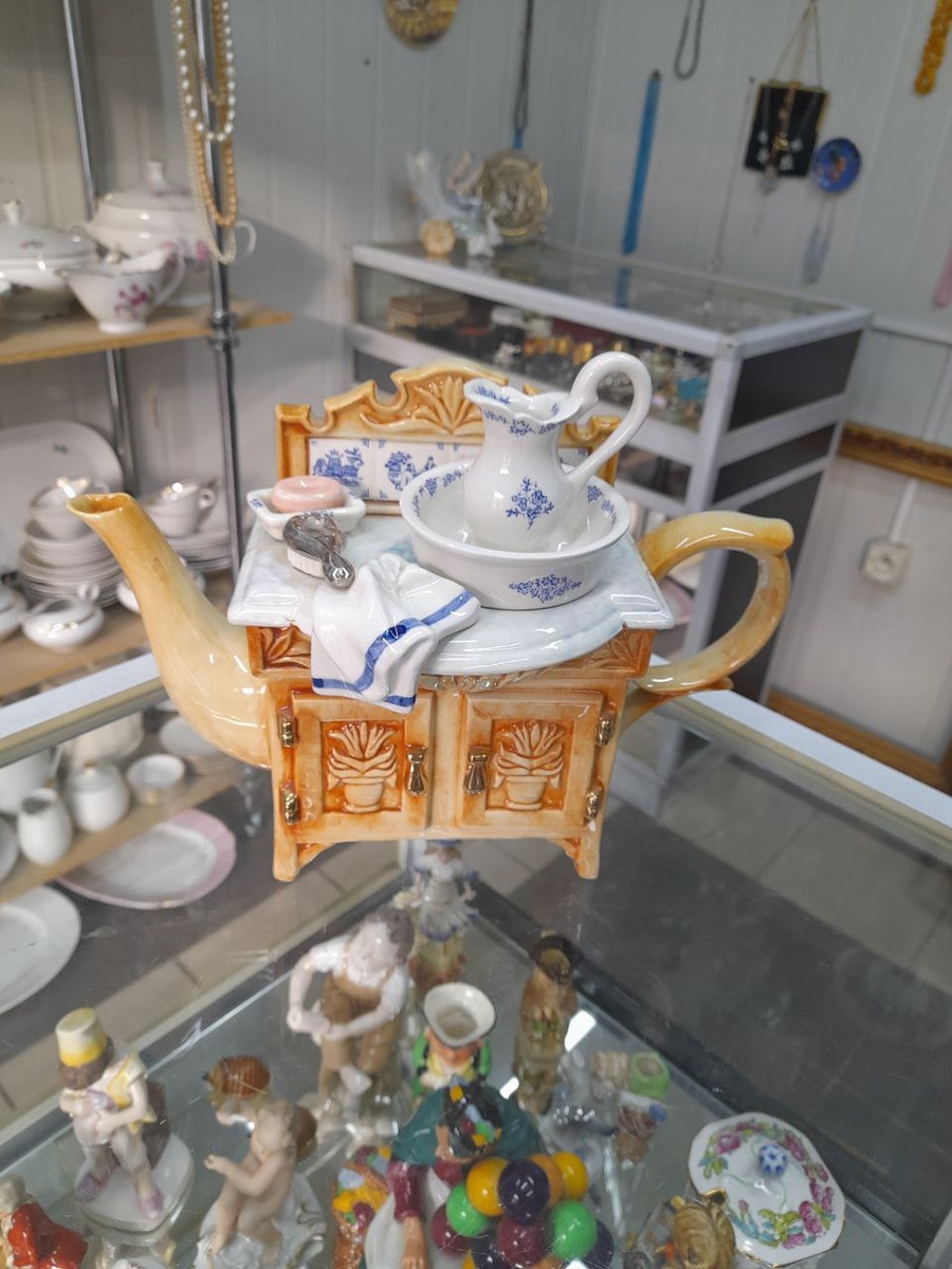 Доброго всем дня! Заключительная часть обзора антикварных магазинов и блошиного рынка. И мои покупки. В одном из магазинов произвел впечатление чайник. Не только видом, но и ценой 18 000р . Собственник еще цену снизил. Была 26 000 р. А это такая крышечка, в виде кувшина с тазиком. Ваза Кобальт, довоенная. КПМ, расшифровывается как " Королевский фарфоровый завод Берлина". Про это клеймо я услышала впервые, пришлось даже почитать. Фарфор Мейсен, довоенный. Довоенные столовые приборы. На витринах немецкий фарфор вперемежку с советским. Блюдо Дулево Астры. На заднем плане чашки с блюдцами ЛФЗ. Чайная пара "Limoge" Среди рубиновых ваз советский кувшинчик из цветного стекла 2500. Красивый кофейник. Уже уходя из магазина увидела на полу,в пластмассовом ведре, фруктовницу. Моя мечта, точно такая же стоит на всех иллюстрациях в моих кулинарных книгах 50- х годов. Сталинский ампир, хрусталь. Очень тяжелая, выполняла роль держателя двери. Я поинтересовалась ее судьбой и продавец, сказала, что ку