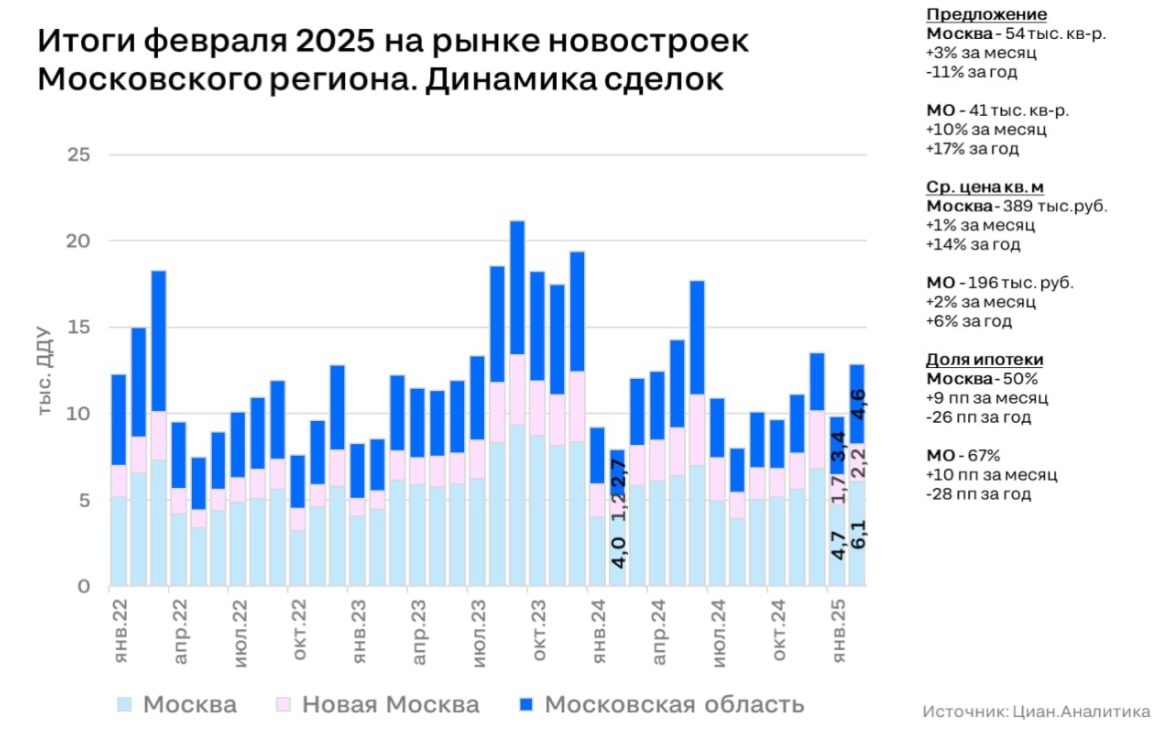 В феврале 2025 в Москве и Подмосковье было зарегистрированы 12.9 тыс. сделок с квартирами и апартаментами в новостройках (+30% в месячном выражении, +62% в годовом). По числу ДДУ - это лучший результат с момента отмены льготной ипотеки (за вычетом традиционно более “результативного” декабря).
