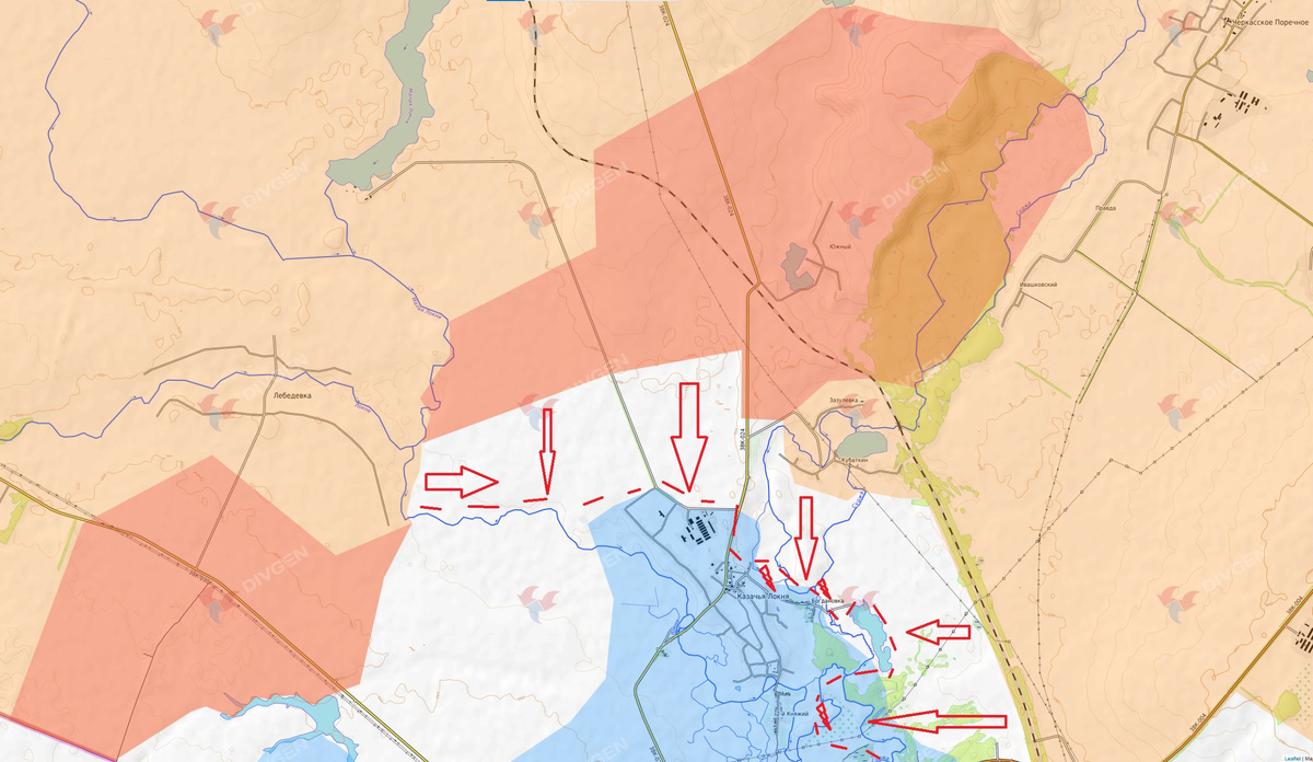 Мясник Сырский де-факто подтвердил разгром на Курщине. «Подразделения осуществляют своевременные меры по маневру на выгодные рубежи обороны», - заявил он. Ну да, маневрируют. Большинство в Ад, меньшинство - в плен. Кстати, только по документально подтвержденным данным, 8,9 и 10 марта ВС РФ освободили 163,6 кв.км. и 15 н.п. Реально же на утро 11 марта, с учетом боев в пригородах Суджи – промке и Замостье – раза в полтора больше. Карта с подробностями уже не влезает в кадр – здесь почти весь участок – от Погребков на севере до Гуево на юге. Обведенные синим участки пока без подтверждения, но известно, что по данным на 14 часов вчера нам оставалось освободить 18 н.п., вкл. Суджу и пригороды отдельно. При этом уже известно, что к утру 11-го из этих 18-ти освобождены Махновка, Колмаков, Дмитрюков и Богдановка, заканчивается, а может и уже освобождены Казачья Локня, Меловое, 1 и 2 Княжий. Бои идут в Замостье /пригород/ и самой Судже. Прорыв с СЗ в Заолешенку, северный пригород Суджи, пока