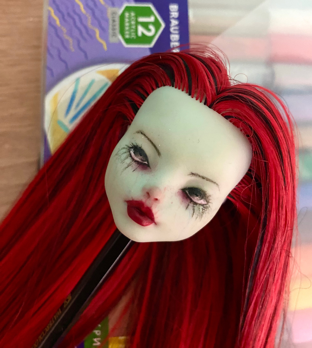Ура-ура, ее голова, наконец, допрошита! Правда, без приколов и сюрпризов не обошлось. Во-первых, ее макияж оказался не закрепленным 😏И когда на него попала вода, он слегка… потёк. Хорошо, что только часть брови, несколько ресниц и дорожки на щеках. Моего скилла хватило на то, чтобы все это подправить. Заклирила. Теперь никуда не денется. Во-вторых, я поломала шейный шарнир у тела, которое этой клоунессе предназначалось 🙈 Попробую починить из г@вна и палок при помощи проволоки и пуговицы (подсмотрела в сети такой лайфхак), потому что найти тело Френки по вменяемой цене - долбаный квест. По сути, если мне удастся починить шарнир, то для завершения образа останется буквально пара мелочей. Играть я ею все равно не планирую, я хотела просто персонажа из мрачного цирка, и этот «конструктор» у меня потихоньку собирается во что-то похожее на задумку. Имя она уже получила - Минди. Потихоньку в голове вырисовывается история и характер. А вообще, забавно у меня все выходит с ООАКами. Из тре