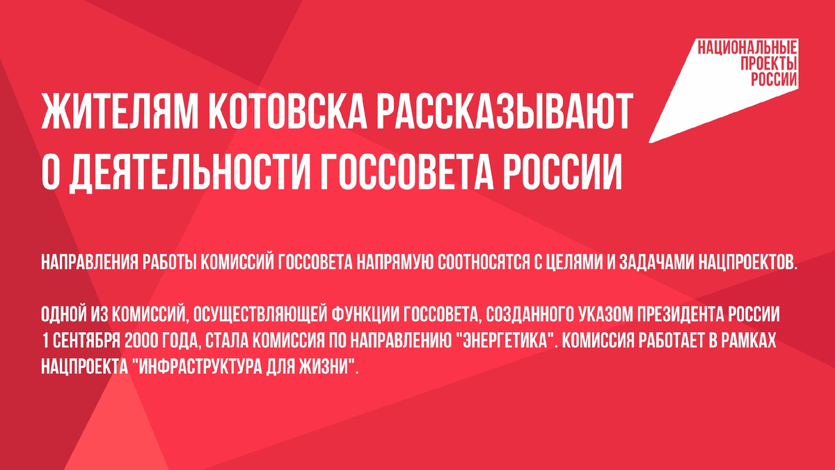 Направления работы комиссий Госсовета напрямую соотносятся с целями и задачами нацпроектов. Одной из комиссий, осуществляющей функции Госсовета, созданного указом президента России 1 сентября 2000 года, стала комиссия по направлению "Энергетика". Комиссия работает в рамках нацпроекта "Инфраструктура для жизни". Как подчеркивает председатель комиссии по направлению "Энергетика" Айсен Николаев, для уменьшения числа аварий и потерь в системах централизованного теплоснабжения требуется ускорить темпы обновления инфраструктуры. Ожидаемый объем плановых инвестиций в развитие систем теплоснабжения страны составляет более 414,5 миллиардов рублей. Правительство России утвердило "дорожную карту", предусматривающую повышение доступности информации о тарифах на горячую воду, повышение ответственности единых теплоснабжающих организаций за нарушение обязательств.