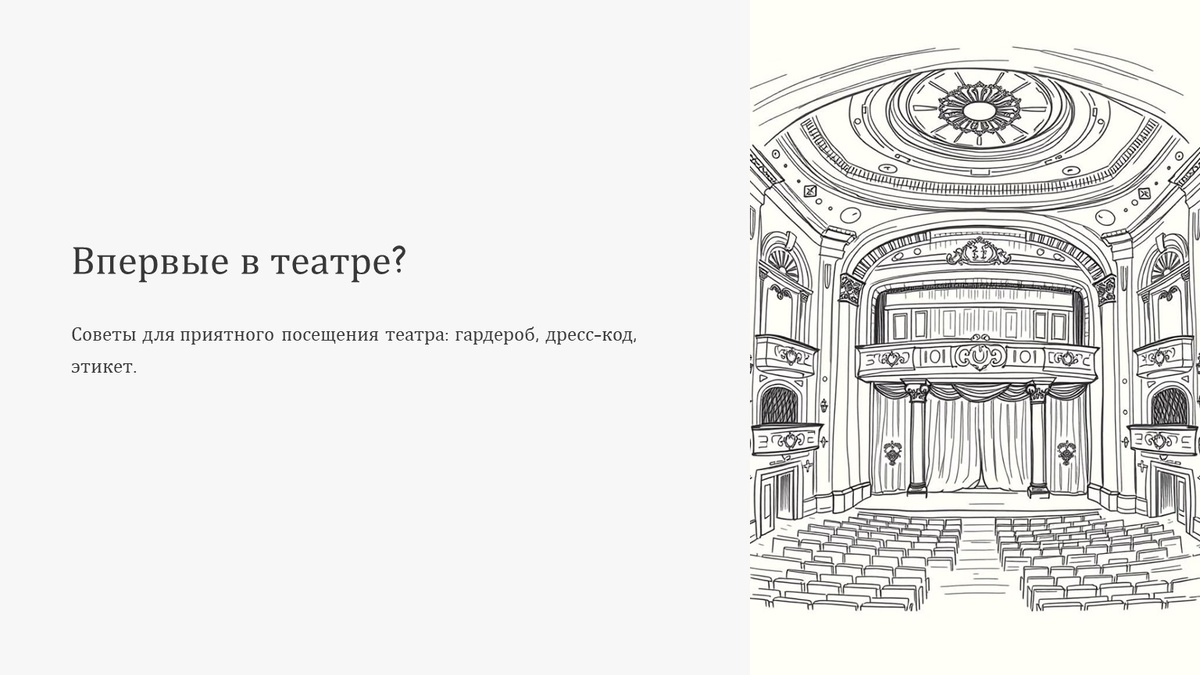 Я часто слышу переживания о том, что в театр нечего надеть. Если вы посещаете это заведение впервые – зайдите на его сайт, там всегда можно найти правила посещения и дресс-код. Если требований к одежде нет, то достаточно не надевать спортивный костюм, шорты, футболки с забавными надписями. Джинсы – можно, кроссовки – можно, нейтральную футболку – можно. Резкий парфюм – нельзя. Ну и не ешьте перед постановкой ничего ароматного.