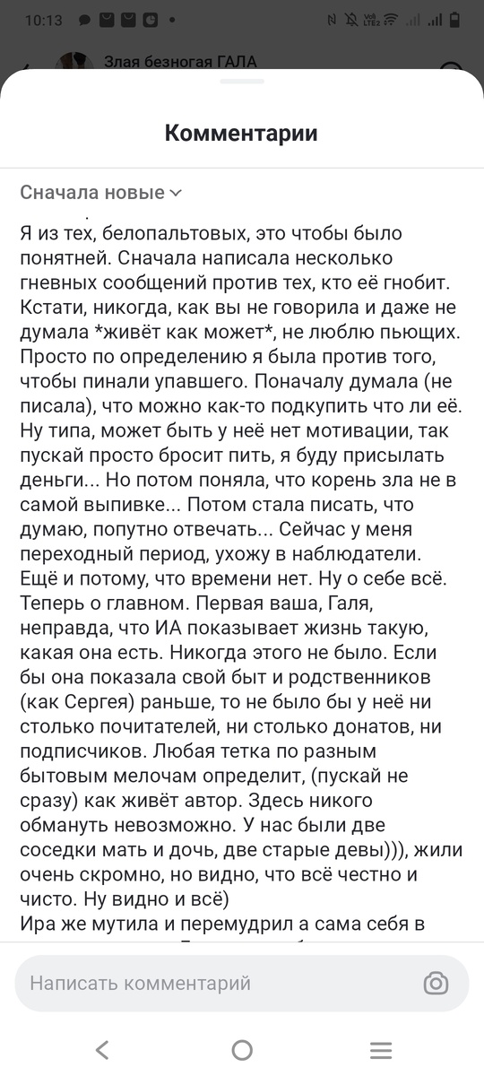 Ну а про жизнь, такую, как она есть, я говорила, имея в виду только жизнь ИА. Я полностью согласна с вами, так жить нельзя. И ,да, все мы видим, как она живёт. По фотографиям, по тем же статьям, но это же ее жизнь, и именно про это канал. Ничего другого мы там не найдем. Никому не нужные животные, бытовая яма, и не очень красивый каждодневный рацион. Ну и,простите меня, не каждой женщине нужен мужчина, который рядом с ИА. И нет, мне это тоже не нравится. Не понятно, в каком месте своей жизни она сломалась. Ведь я тоже читаю ее с самого начала. И помню, как она тогда описывала свою жизнь.