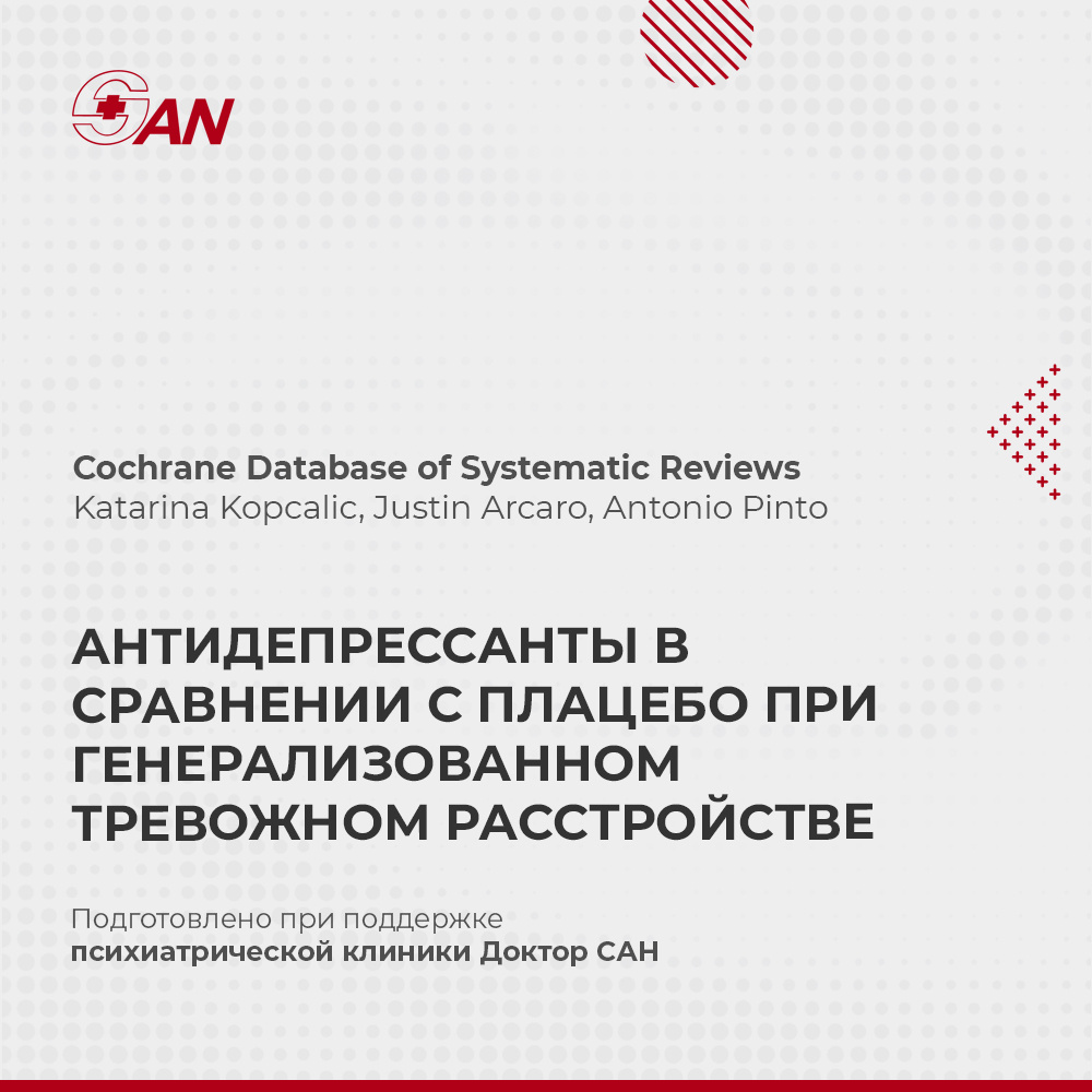 В систематическом обзоре, опубликованном в Cochrane Database of Systematic Reviews, оценивалась эффективность антидепрессантов при генерализованном тревожном расстройстве (ГТР) у взрослых. В исследование вошли 37 рандомизированных контролируемых испытаний с участием 12 226 пациентов. Результаты показали, что антидепрессанты значимо превосходят плацебо в достижении терапевтического ответа, который определялся как снижение симптомов тревоги на 50% и более по шкале HAM-A. Однако частота прекращения участия в исследованиях из-за побочных эффектов была выше в группе антидепрессантов, что подчеркивает важность тщательного мониторинга пациентов во время лечения. Подробнее о лечении ГТР: https://doctorsan.ru/generalizovannoe-trevozhnoe-rasstroystvo