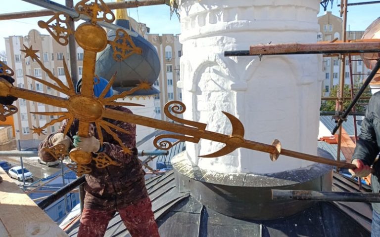 В Саранске продолжается масштабная реставрация старейшего каменного храма города – Иоанно-Богословского собора. «Известия Мордовии» уже подробно рассказывали о том, как у этого красивого старинного храма, шедевра «нарышкинского» барокко 17 века, восстанавливали и укрепляли фундамент, старинную кирпичную кладку, заменяли инженерную инфраструктуру. Причем, несмотря на масштабные работы, собор по-прежнему каждый день открыт для верующих. Жители Саранска обратили внимание на то, что сейчас на соборе заменяют кровлю. Привычные для нас чёрные купола заменили на новые: красновато-медные. Но такими они будут совсем недолго, так что — «спешите видеть». Со временем натуральная медь вновь покроется тёмным налётом. Чёрный цвет куполов Старого собора — это слой естественного покрытия, который формируется под воздействием кислорода. Кстати, такой налет является лучшей защитой от атмосферных явлений. — А вот золото на старинных крестах собора, конечно, останется. Сейчас их аккуратно снимают, спускают