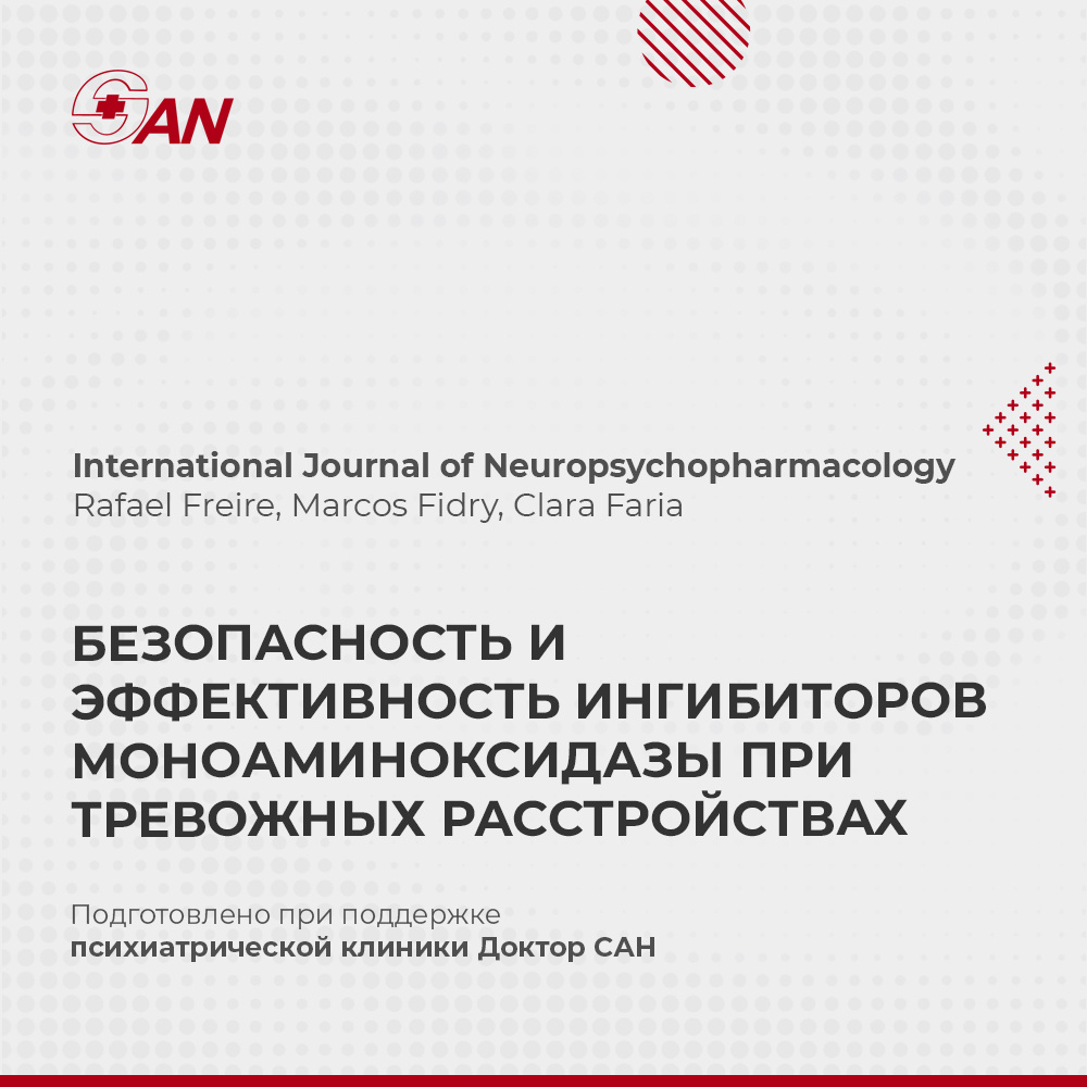 В систематическом обзоре и мета-анализе, опубликованном в International Journal of Neuropsychopharmacology, оценивалась эффективность ингибиторов моноаминоксидазы (ИМАО) при лечении тревожных расстройств, таких как социальная тревога и паническое расстройство. В анализ были включены 24 клинических исследования, в том числе 13 рандомизированных контролируемых испытаний (РКИ). Среди изученных препаратов были моклобемид, фенелзин, брофаромин и транилципромин. В 11 из 13 РКИ ИМАО оказались значимо эффективнее плацебо. Однако при сравнении с другими антидепрессантами ИМАО не показали превосходства, но продемонстрировали сопоставимую эффективность. В общей сложности в анализе приняли участие 1 535 пациентов, из которых лишь 0,4% испытали серьезные побочные эффекты. Источник: https://academic.oup.com/ijnp/article/28/Supplement_1/i267/8009522