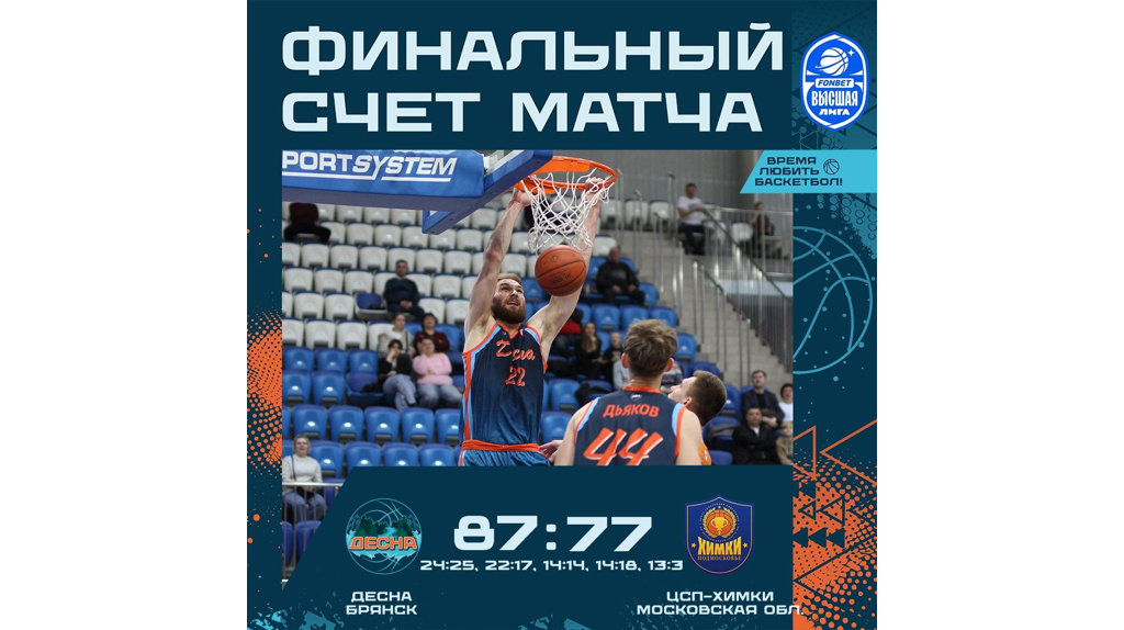 В очередном туре чемпионата высшей лиги по баскетболу брянская «Десна» на своей площадке одержала две победы над клубом «ЦСП-Химки» из Московской области. Но в отличие от первой встречи, в повторной гости начали за здравие. Первая четверть завершилась в их пользу, хотя и с разницей всего в одно очко - 24:25.