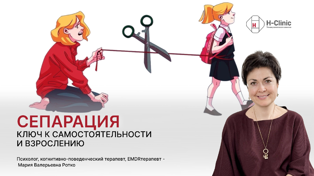 Статья психолога, когнитивно-поведенческого терапевта, EMDRтерапевта - Марии Валерьевной Ротко Сепарация — это естественный процесс, который начинается еще в детстве и продолжается до зрелого возраста. Этот переход важен для формирования здоровой и независимой личности, способной успешно взаимодействовать с миром. Однако далеко не всем удается пройти этот путь гладко. Проблемы, связанные с отсутствием сепарации, могут оказывать глубокое влияние на различные аспекты жизни человека: от личных отношений до профессионального успеха. Как отсутствие сепарации влияет на жизнь? - Не складываются отношения, не создается семья; - Не получается родить собственных детей; - Человек не может найти себя в жизни, меняет виды деятельности один за другим; - Сложно зарабатывать нормальные деньги; - Либо заработок хороший, но тратится не на себя, или не получает удовольствие от трат на себя; - Человек не является авторитетом для собственных детей, мужа/жены; - Финансовая зависимость от родителей, использо