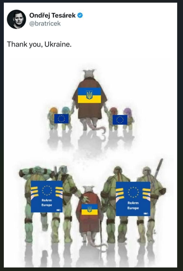 Вот смотрю. И думаю - как ее трактовать-то? Встретилась в англоязычной соцсети. Вместо подписи - 🇺🇦🇪🇺 Cringe. Ну, слово "кринж" вам, наверное, известно. Примерно - испанский стыд. Автор картинки - чешский комментатор и ютубер 1990 года рождения. "Дитя бархатной революции", как пишут о нем в интернете. Зарабатывает в соцсетях, имеет продуктовый магазинчик "Колониальный братишка" (существительное из названия - его ник в интернете). Небрат нам. И материально поддерживает небратьев. *** К моему персональному стыду я никогда не смотрела мультсериал, персонажи которого изображены на картинке. И спросила у молодежи - кто там посередине с хвостом? Ответ: "Короче, крыса посередине - это мастер Сплинтер, он типа вырастил этих черепашек-ниндзя как мастер боевых искусств и приёмный отец Тут аллюзия на то, что Украина взрастила Европу и ReArm Europe , а когда они выросли, уже сами ведут пожилого учителя и наставника". О, как! Получили? *** Добавлю, что ReArm - это перевооружение Европы. Прог