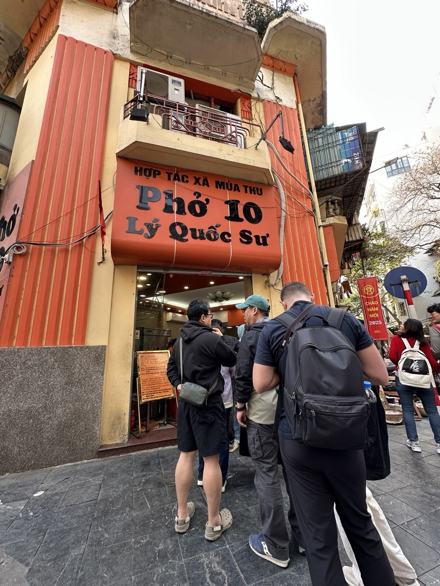 Начитавшись восторженных отзывов о вьетнамском кофе с яйцом, мы перешерстили весь интернет и видео-сервисы в поисках самого вкусного да еще и с аутентичной подачей и отложили себе в закладки несколько интересных заведений, а также параллельно нашли отличные рекомендации по еде, так что делимся тем, что сами уже и отпробовали: Прибыв во Вьетнам, конечно же, первым делом отправляемся за традиционным супом Фо Бо в Pho 10 Ly Qouc Su: Уже на подходе видим очередь на посещение и надеемся что наши ожидания оправдаются. Заведение вошло в гайд MICHELIN (по ссылке можно удостовериться). Немного отстояв в очереди, попадаем в само заведение. С виду обычное место, ничем не примечательное, традиционный интерьер, на вид даже бедноватый, но мы же не судим о книге по её обложке. Людей очень много, все сидят плотно, столики на 4 и 6 человек, подсаживают на любые свободные места: 3 минуты ожидания и нам приносят, заказанный нами, традиционный суп Фо Бо, напиток, лайм и какие-то острые приправы: Ну ч