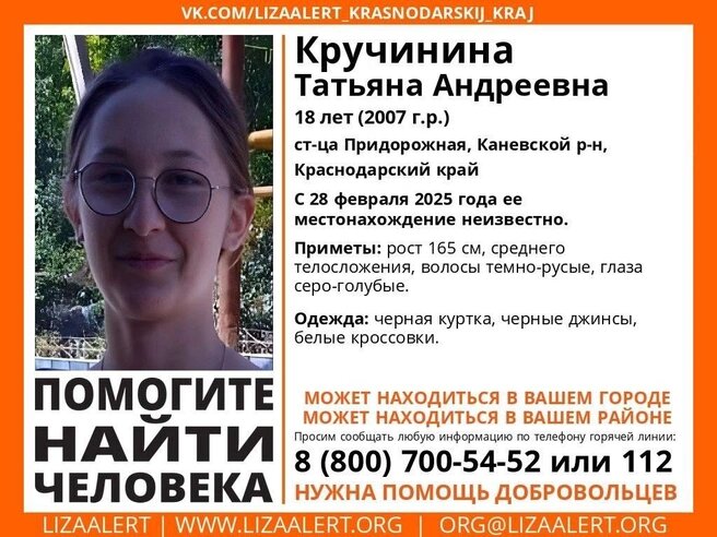 В станице Придорожная Каневского района Краснодарского края разыскивают 18-летнюю Татьяну Кручинину, которая бесследно исчезла пять дней назад. По данным поисково-спасательного отряда «ЛизаАлерт», девушка вышла из дома 28 февраля и с тех пор о ней нет никаких известий. Родные Татьяны забили тревогу, когда она не вернулась домой и перестала выходить на связь. К ее поискам подключились волонтеры, полиция и местные жители. На данный момент группа добровольцев прочесывает близлежащие территории, включая парки, лесополосы и заброшенные здания, где девушка могла укрыться. Приметы пропавшей: рост 165 см, среднее телосложение, темно-русые волосы, серо-голубые глаза. В день исчезновения она была одета в черную куртку, черные джинсы и белые кроссовки. Поисковики обращаются к жителям региона с просьбой обратить внимание на ориентировку и при наличии любой информации о возможном местонахождении девушки незамедлительно сообщить по телефону горячей линии: 8 800 700 5452. Каждая деталь может помочь в