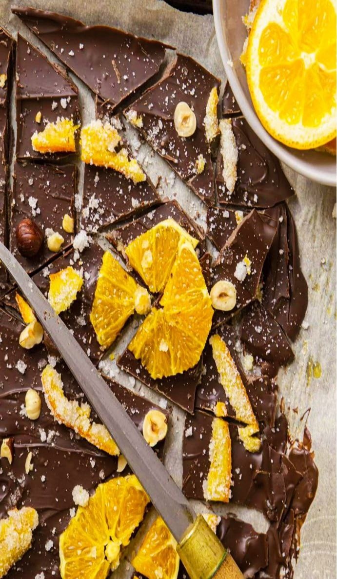Этот шоколад прекрасно подойдёт в качестве небольшого презента друзьям, коллегам, любимым, или в дополнение к основному подарку. Ведь то, что мы готовим сами, с душой всегда ценится больше, чем стандартная покупная плитка шоколада. Этот рецепт относится к разряду быстрых рецептов, все ингредиенты можно легко купить в магазине, а результат вас порадует своим изысканным вкусом и изумленными лицами одариваемых вами людей. На 8 порций вам потребуется. 400 грамм сахара 1 апельсин 135 грамм фундука 500 грамм темного шоколада 50 грамм коричневого сахара Способ приготовления. С апельсина снимите кожуру, порежьте её крупно. Сам апельсин порежьте поперек на тонкие ломтики. В кастрюле растворите сахарный песок в двух стаканах воды, добавьте цедру апельсина и варите на маленьком огне, помешивая периодически, пока весь сахар не растворится. Положите кружки апельсина и готовьте ещё 15 минут. На противень, застеленный бумагой для выпечки, выложите дольки и цедру апельсина, посыпьте немного сахаром