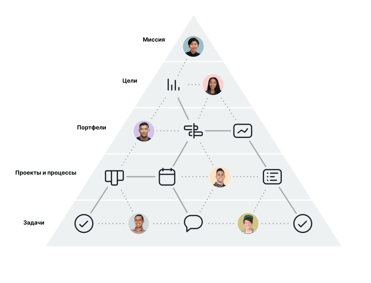 Лично я рекомендую Asana, так как она по умолчанию не дает широких возможностей кастомизации, вместо этого предлагая четкую логику работы, заточенную под коллаборацию команд. В Asana это называется пирамидой ясности.