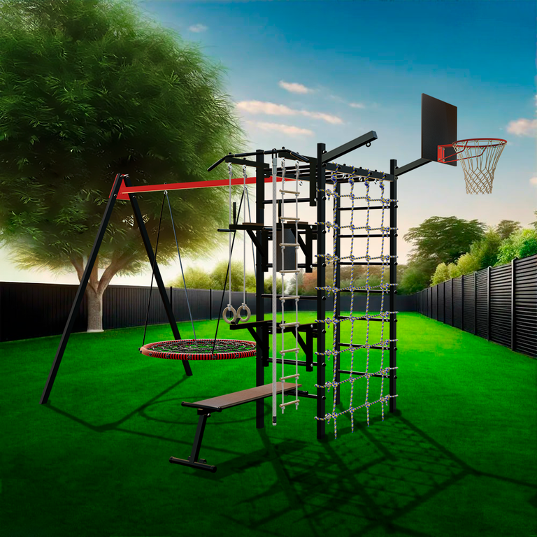 Уличный спортивный комплекс с качелями, турник, брусья, баскетбольным щитом.