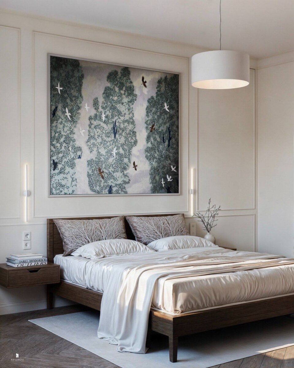Когда за окном шумит город, так важно, чтобы дома было пространство для тишины. Эта спальня в сталинской квартире словно создана для глубокого выдоха и ощущения полной гармонии. Панно с летящими птицами 🕊 наполняет интерьер лёгкостью, создаёт глубину и дарит ощущение бесконечного простора. Дополняют эту тему текстиль с узором ветвей и изящные молдинги. Тёплое дерево в мебели придает интерьеру тактильного уюта. А лаконичные формы делают пространство лёгким, но при этом наполненным характером. Высокие потолки и изящная лепнина напоминают об архитектурном наследии, но отсутствие излишеств и чистота линий делают интерьер актуальным и живым. Здесь хочется замедлиться, отпустить лишнее и просто наслаждаться моментом. Как вам такая атмосфера?⤵️ Больше пользы и классных интерьеров в Телеграм канале студии krasnov_d - https://t.me/+XuhDDI9cYlo4MjIy