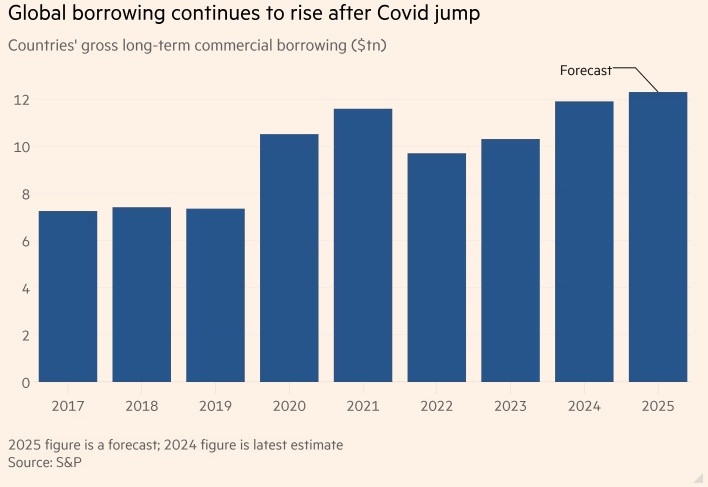 S&P прогнозирует, что рост выпуска облигаций приведет к увеличению объема долгосрочного долга до $76,9 трлн. В этом году ожидается, что объём государственных заимствований в мире достигнет рекордных 12,3 триллионов долларов США. Это связано с увеличением расходов на оборону и другие нужды крупнейших экономик, а также с ростом процентных ставок. По оценкам S&P Global Ratings, выпуск суверенных облигаций в 138 странах вырастет на 3%, что приведёт к увеличению общего объёма долга до 76,9 триллионов долларов. Это связано с последствиями мирового финансового кризиса, пандемией коронавируса и необходимостью увеличения расходов на оборону в Европе. Крупные экономики сосредотачиваются на фискальной политике, чтобы справиться с продолжающимися кризисами. В результате мы получаем более обременённую суверенными долгами картину, — говорит Роберто Сифон-Аревало, глобальный руководитель отдела суверенных долгов в S&P. Он отмечает, что ситуация ухудшилась из-за роста расходов на обслуживание долга, т