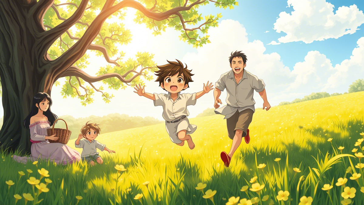 Хару бежал впереди, его босые ноги мелькали по траве, а смех звенел, как колокольчик. Кента притворялся, что не может его догнать, делая большие, неуклюжие шаги и громко ворча: "Ох, ты слишком быстрый, Хару! Я сдаюсь!" Но потом он ускорялся, и Хару, взвизгивая от восторга, чувствовал, как сильные руки отца подхватывают его под мышки. Кента подкидывал его вверх, к небу, к солнцу, и Хару казалось, что он летит — свободный, невесомый, полный счастья. Ветер трепал его волосы, солнце слепило глаза, а сердце колотилось от чистой, незамутнённой радости. Когда он приземлялся обратно в объятия отца, то смеялся так громко, что птицы в ветвях дуба взлетали в небо.