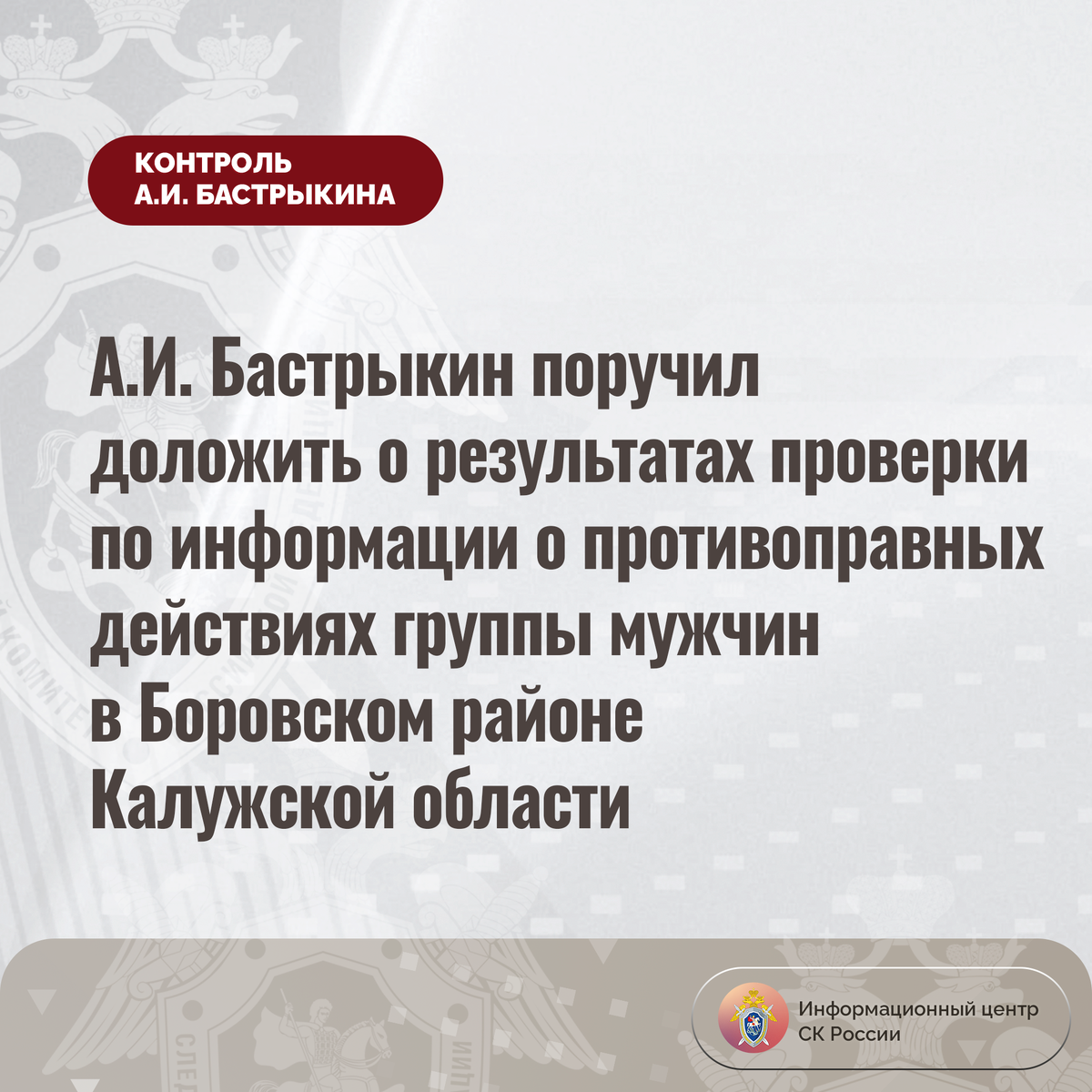 А.И. Бастрыкин поручил доложить о результатах проверки по информации о противоправных действиях группы мужчин в Боровском районе Калужской области