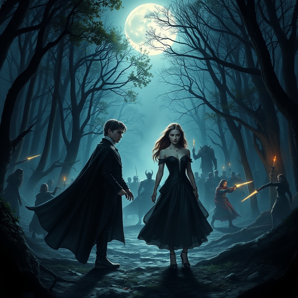В густом лесу, где деревья обвивали друг друга, словно запутавшиеся судьбы, находилось древнее королевство — Нокталиус. Его жители были вампирами, но не обычными. Каждый из них обладал уникальной силой, дарованной Луной, которая освещала их мир лишь раз в месяц, когда наступала полнолуние. Давным-давно, когда мир еще не знал о свете, а тьма царила повсюду, вампиры наслаждались своей вечной жизнью, охотясь на ночных животных и питаясь их энергией. Появление первых людей изменило всё. Полные страха и недопонимания, люди начали охоту на вампиров, и мир стал полон конфликтов и ненависти. Главным героем нашей истории был молодой вампир по имени Элиан. Он был сыном короля Нокталиуса и обладал даром управления тенями. Элиан с детства мечтал объединить вампиров и людей, чтобы положить конец вековой вражде. Однако его мечты казались безнадежными, пока он не встретил девушку по имени Лия. Лия была человеком, но обладала редким даром — она могла видеть ауры живых существ. Однажды, заблудив