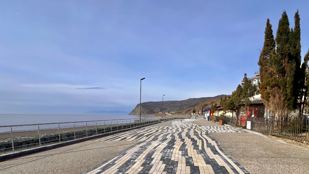 Это самая холодная весна за последние годы! Удивительно, что декабрь и январь был на десять градусов теплее марта. Обычно в это время уже цветёт миндаль, но не в этот раз. Пойдемте с нами на крымский Язык троля, всё покажу. Путь начинаем от набережной поселка Весёлое. В самом конце года её отремонтировали, вернее, построили на месте старой грунтовой дороги. Не смотря на такое масштабное улучшение инфраструктуры Крыма, после выхода моей статьи нашлось очень много недовольных комментаторов. Заглядывайте, если интересно. А мы идём вдоль шикарного пляжа. Море чистое, мазута нет. Многие сейчас пишут, что летом он может подняться из глубины на поверхность. Поживём — увидим. Пока что в этом уголке Крыма всё хорошо. Идём по набережной, восхищаемся красивыми объектами. Тут построили много всякого разного: и стенды с рассказами про море, и схема двигателя корабля, и вот такой погонный стенд. Чтобы знать, кто какие погоны носит на флоте. Набережная заканчивается шлагбаумом и дальше вверх идёт тр