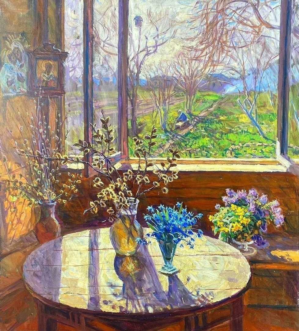 Натюрморт – загляденье! Хороши и залитый солнцем стол, и вазочки разной формы, и, конечно, яркие весенние цветы. В раскрытое окно льется свежий, теплый, пахучий весенний воздух, а ожившая, проснувшаяся земля зовет к трудам. Иконы в углу как будто проясняют идею этой картины – «Слава Богу за все!».