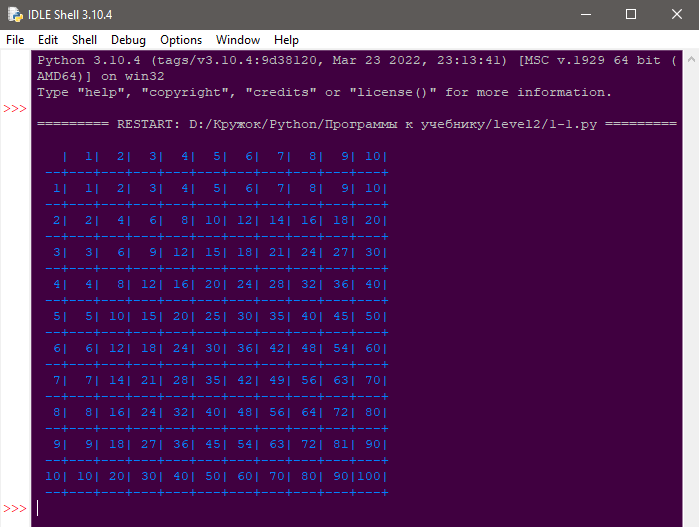 1. Воспроизвести таблицу Пифагора:
