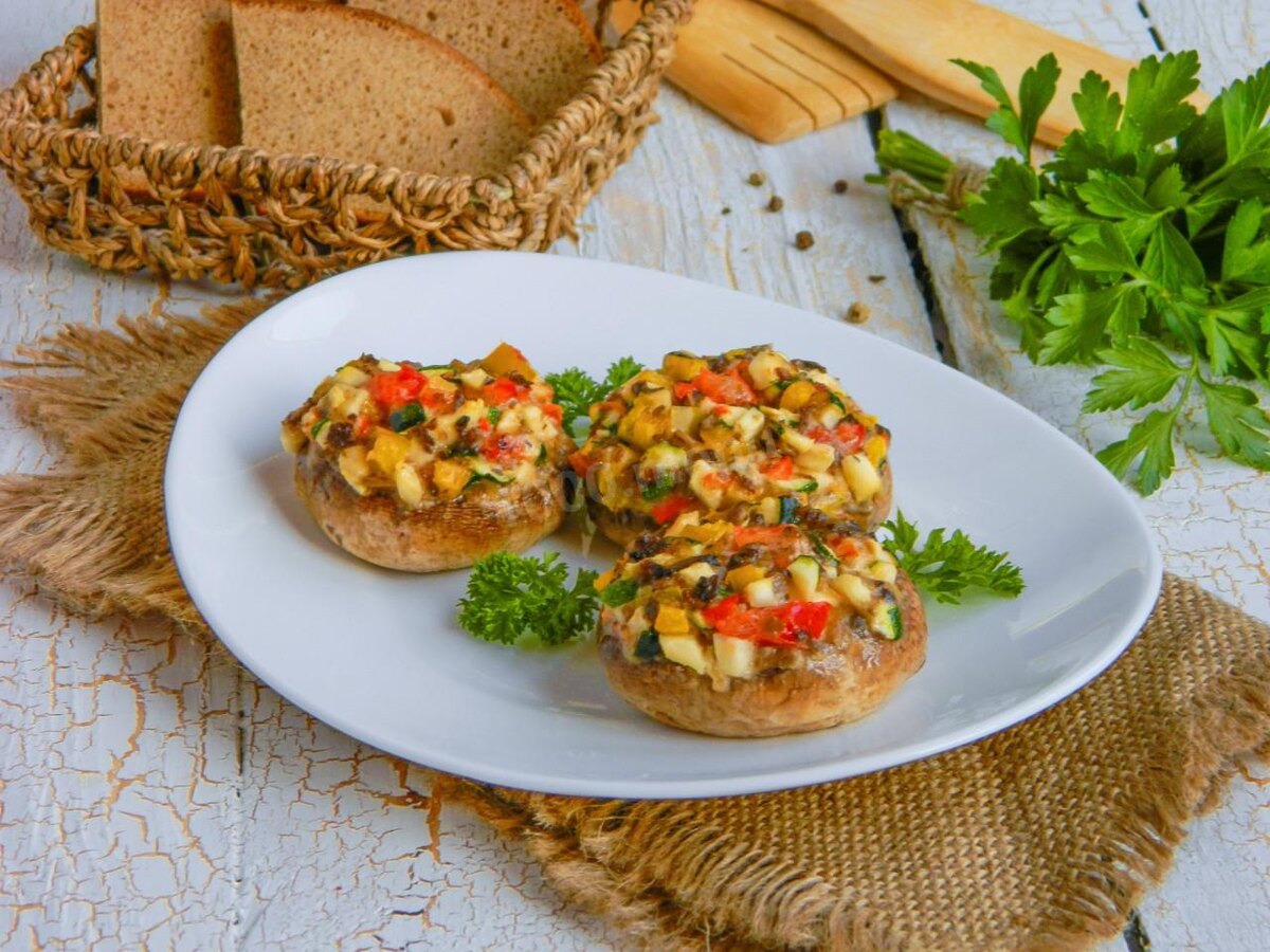 Наполните шампиньоны начинкой и выложите на слегка смазанную маслом форму. В процессе запекания овощи потеряют объем. Поэтому чтобы не получить в итоге "пустые" шампиньоны, старайтесь поместить в них как можно больше начинки. Запекайте при температуре 200 градусов в течение 15-20 минут. Точное время зависит от возможностей вашей духовки. Готовые шампиньоны дадут сок и начинка немного опустится.