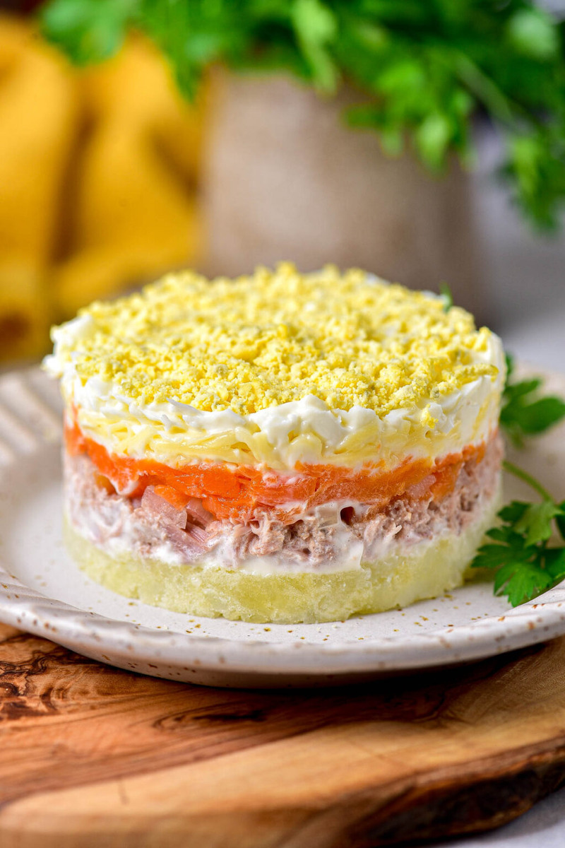 Отправьте салат в холодильник минимум на 2 часа – так слои лучше пропитаются и станут нежными. ✔ Вместо слоя картофеля можно использовать сливочное масло, натёртое на тёрке.