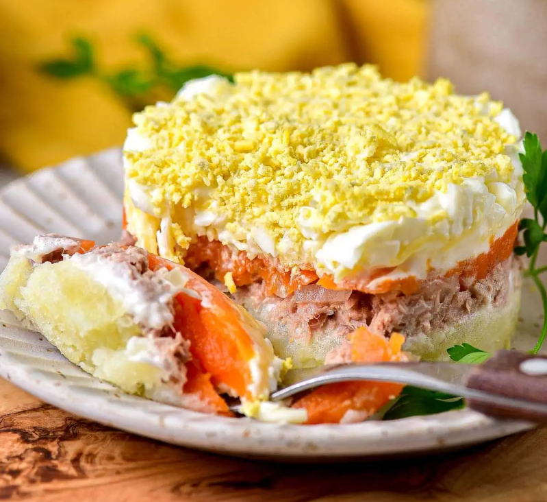 Можно приготовить в глубокой тарелке или выложить порционно с помощью формочек. 🔹 1 слой – натёртый картофель + немного соли + майонез. 🔹 2 слой – разомнутый тунец + лук. 🔹 3 слой – натёртая морковь + майонез. 🔹 4 слой – натёртый сыр + майонез. 🔹 5 слой – натёртые яичные белки + майонез. 🔹 6 слой – натёртые яичные желтки (создавая эффект "мимозы"). 3️⃣ Охлаждение: