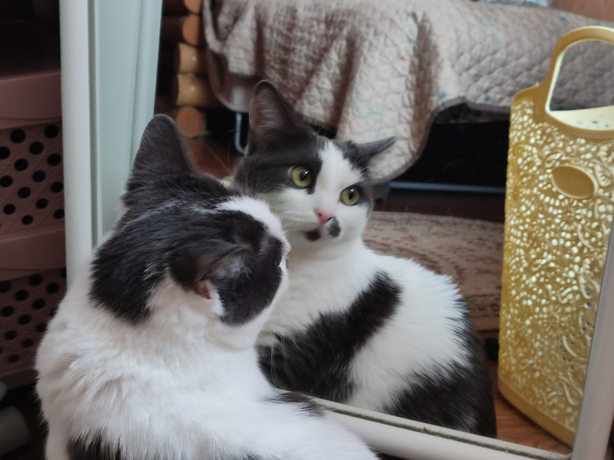 Утро началось в начале восьмого. Не проснулась ночью ни разу, сквозь сон слышала, как Мартыша наводила порядок в своём лотке, слышала, как она приходила меня будить и мяукала в ухо. Проснулась отдохнувшей в семь. Наконец-то! Открыв глаза, обнаружила Сардельковну, лежащую рядом со мной. Вот это новости) Видимо она тоже не ожидала, что я за ночь ни разу не проснусь, не налью ей свежей водички, не включу телефон, а просплю до самого утра. Решила, на всякий случай, полежать рядом и проконтролировать всё ли со мной хорошо) Вечером шел снег, но днём температура плюсовая, хоть и пасмурно. Села вязать и тут Мартыша начала исполнять, то ей за мышкой побегать, то за телевизор залезть, то за зеркало. Опять же баночки с кремом сами себя со стеллажа не скинут 🤭 А если залезть за зеркало, то там можно на славу похулиганить. Я не успевала схватить телефон, чтоб сфотографировать её проказы. Но кое-что всё-таки поймать получилось. Повыкидывав все игрушки из своей корзинки, она подошла к моей корзи